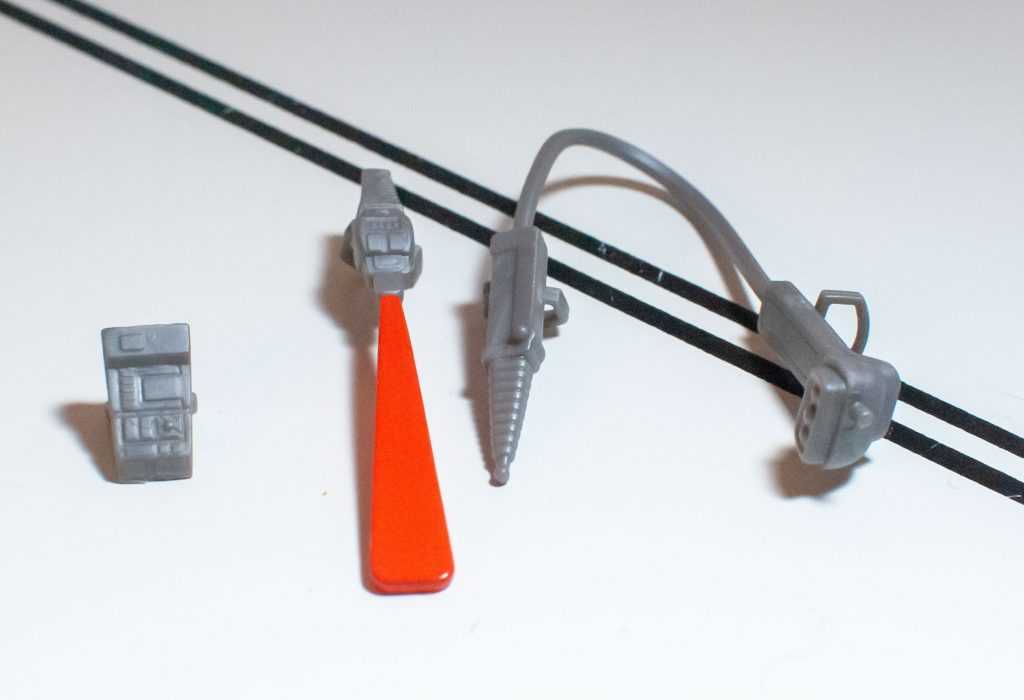 Finally, he’s got a weird two-handed accessory that doesn’t seem to be based on anything specific (I think), two pieces of technology connected by a flexible plastic cord, one looking like a drill, and another like a price scanner.