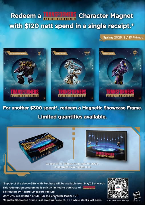 Via several retailers from Singapore and Malaysia, we have images and information about the new Official Transformers Age Of The Primes Magnets Campaign By Hasbro Asia. Spend a minimum of $120 SGD (about $92.00 USD) in a single receipt in store and redeem an exclusive Transformers: Age of the Primes Character Magnet while supplies last. The 13 Primes will be released, and the first ones are Megatronus The Fallen, Prima Prime and Solus Prime. But there’s more! A special Magnetic Showcase Frame will also be available in the future for purchases over $300 SGD (about $231.04 USD). According » Continue Reading.