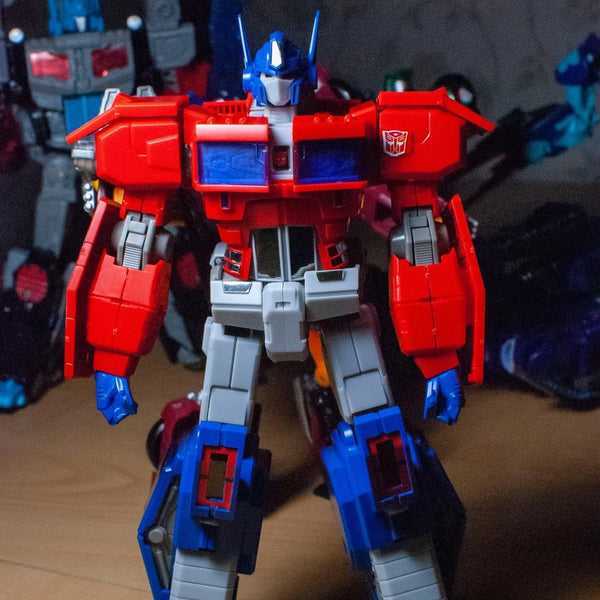 Despite only being a few plastic colors, he looks really colorful. He’s a bright, vibrant red, noticeably brighter than other modern Primes. He’s also a light blue and grey, with some clear blue bits (his eyes and windows). It’s all finished up with shiny foil stickers, that add a few colors, mostly silver. It’s a really characterful sculpt, and communicates a dynamic mood. When he’s neutrally posed, I feel like his legs are a bit too long, and he’s a bit skinny, but he’s begging to be posed, really.