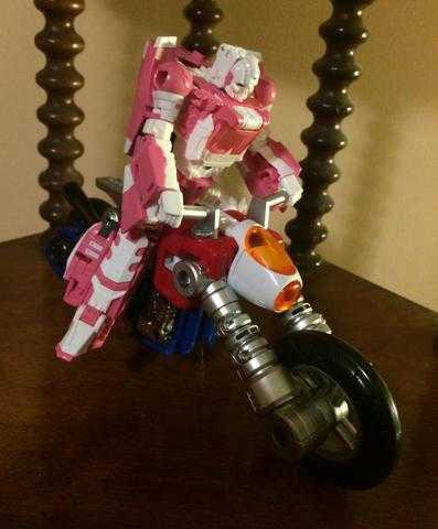 When it comes to that transformation, he’s a bit of a parts-former, where you take the wheels right off of his shoulders and replace them in their correct spots in bike mode. Another accessory comes into play here, as well: An extra face that’s just a blank white space, which you apply to hide his face in bike mode.