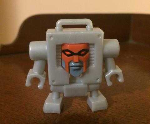 While I’m not familiar with the cartoon, these faces are really neat-looking, cartoonishly expressive and well-sculpted, and most importantly, chock-full of character. One face is a neutral stare, the second one is an exaggerated, angry grimace, and the third is an incredibly smug smile. Putting one of these faces on him totally changes the vibe of the figure, changing him from a retro-robot into a theatrical supervillain, which plays well with that equally-expressive poseability of his. Screenshots from the GoBots cartoon tell me that Cy-Kill was already pretty toy-accurate in animation, so with the face swap, this becomes a Masterpiece-level representation of that character. Even not having knowledge of who he is, I appreciate his characterfulness. There’s another, really odd accessory, too: A small grey plastic slab with arms and legs that you can mount a single one of his faces on. I’ve got no idea what or why, but it’s a neat extra.
