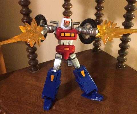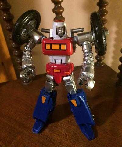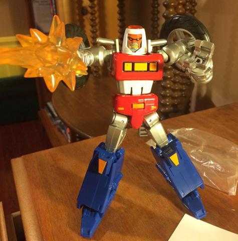 That retro look extends to his color scheme of bright. primary red, white and blue, with yellow and shiny silver bits on him to finish the look, along with some clear orange bits, like a dome on top of his head. His default face is silver with yellow eyes, an immovable Megazord-like expression on his face.