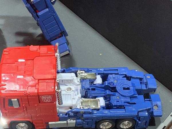 Basically, it starts out similar to the original Optimus Prime toy’s transformation, where he bends his legs back, tucks his head away, and tucks his arms into his sides, only his waist now rotates backwards, a bunch of panels come out of his arms to fill in the truck mode, and his legs basically explode into panels and reform into a more truck-ish shape.