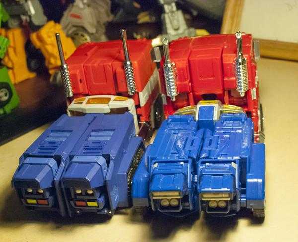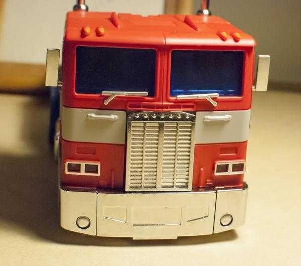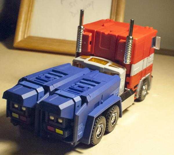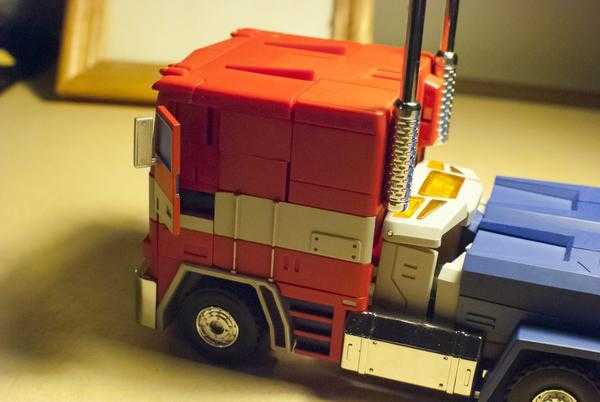 Light of Freedom’s transformation is somewhat more difficult than MP-10’s, but accomplishes its purpose much better, since its parts all hold together much better and more cohesively. And, for the most part, all of his vehicle mode parts actually become the corresponding robot mode parts, whereas MP-10 has two truck grills, one for each mode. (Light of Freedom does have a shrunken set of fake fuel tanks for his robot legs, though).