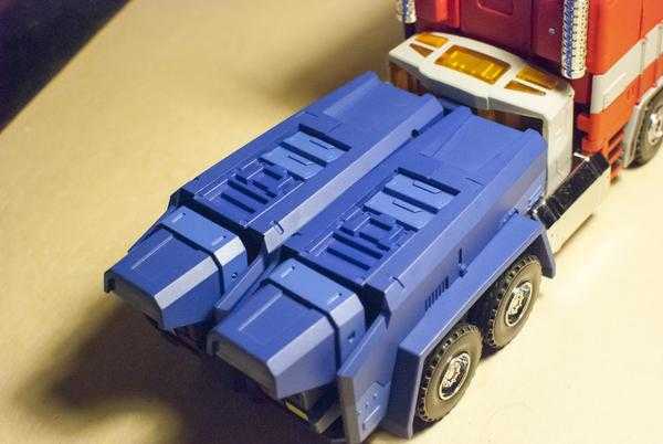 Once again, my first impression of this mode is that it’s extremely clean and cohesive, with everything aligned, and few to no gaps. Let’s get this out of the way, though: Light of Freedom doesn’t come with Prime’s trailer, unlike MP’s 10 and 44 (and can’t connect to MP-10’s trailer for an easy swap, either). That’s going to bother some people, but doesn’t bother me. British Transformers reviewer Thew Adams said it best on Twitter, when talking about a previous Prime released without one: “Y’all know I love G1 and Diaclone but I have literally never spent more than 30 seconds with my G1 Prime’s trailer and have always kinda wished he didn’t bring that damn bulky thing into my house.” Basically, it spends most of its time taking up space somewhere. In the cartoon, it mostly disappeared into thin air anyway. I strongly suspect Magic Square is going to release a trailer of its own eventually, though, thanks to a couple of suspicious panels that you need to flip out on the back of the truck bed that don’t seem to serve any obvious purpose, and go just where a trailer would attach:
