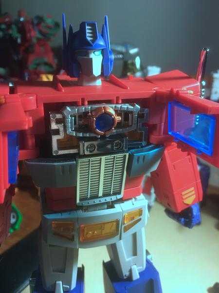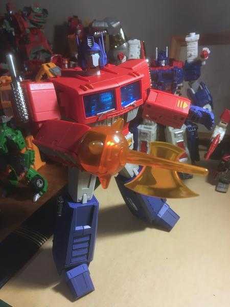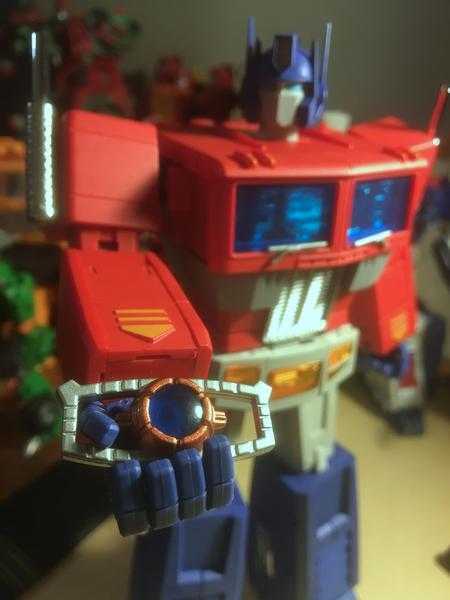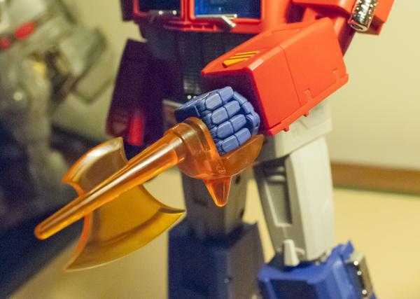 It fits into his hand through a combination of slotting into a ridge on his palm, and his finger joints wrapping around it, and manages to stay in securely. Thirdly, we have his glowing energy axe weapon, which he used in exactly one episode of the original cartoon, but every high-end Optimus has a depiction of, anyway.