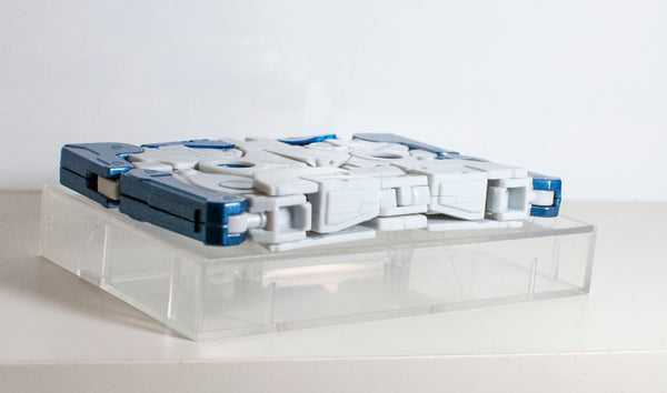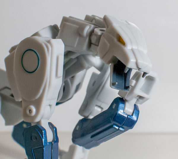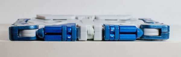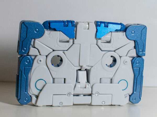 Colors-wise, there’s not a lot to him. He’s got that cold blue outer later (with a bit of blue paint on his tape spools and on a pair of circles on one side), but is otherwise almost entirely solid white. It’s straightforward, but effectively vibrant. It gives me real future-technology-as-filtered-through-Apple vibes, which kind of makes sense if you’re changing into a music device. That being said, there’s a set of paint chips inside of his missile pods visible here, and I’m honestly not sure if he came with them, or if they’re a part of his transformation. At least they’re only visible in this mode.