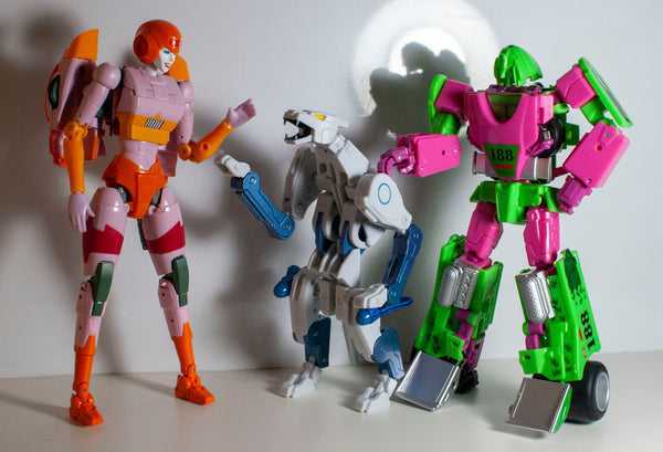 Despite my gripes with his cat mode’s loose, untethered torso, I really like this figure. It’s got piles of personality, a great sculpt, and some really interesting engineering. As a Ravage, it’s easily the best iteration of the character I’ve messed with. In these new colors, and with its humanoid mode, it’s effectively a triple-homage, character-wise. But beyond who it’s supposed to be, I just like the color scheme, and it blends well with some of my other brightly-colored figures.