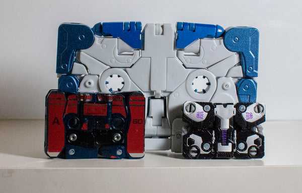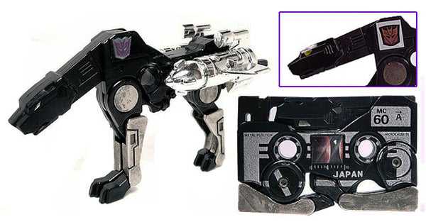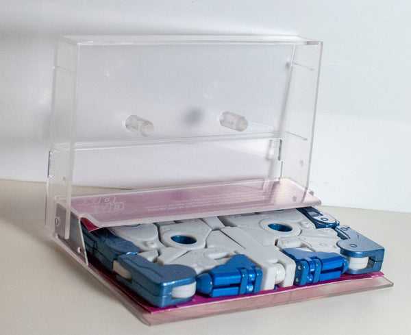 I’ll be honest: I bought this toy without a ton of research (aside from hearing it was pretty good), and when I pulled it out of the box, I was immediately shocked at how LARGE he was. See, Soundwave’s minions have always changed into microcassettes, emphasis on the “micro,” and both the G1 toys, and their official Masterpiece versions were realistic 1:1 scale replicas of the old-fashioned recording medium. However, Doccat, and all of Ocular Max’s other cassettes decided to re-imagine them as being full-sized cassette tapes, and thus are more than double the size of the originals. Here he is compared to Siege Ravage, and a reissue Zauru, another G1 Microcassette: