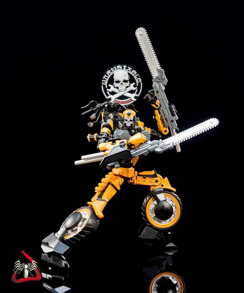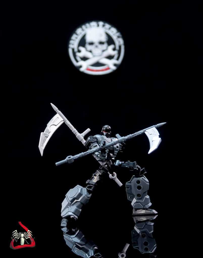 The current lore centers around a robotic motorcycle gang, each of which has the same body, with a different face for each character. Thus, by including different swappable heads, each set can represent multiple characters. Burley is their current leader, while Iride is a new recruit. The Spector Rogues are our villains, a splinter faction of the gang, and Spector General is their leader. Otomo, is a cypher, with no known backstory yet, though he was designed in homage to the movie Akira.
