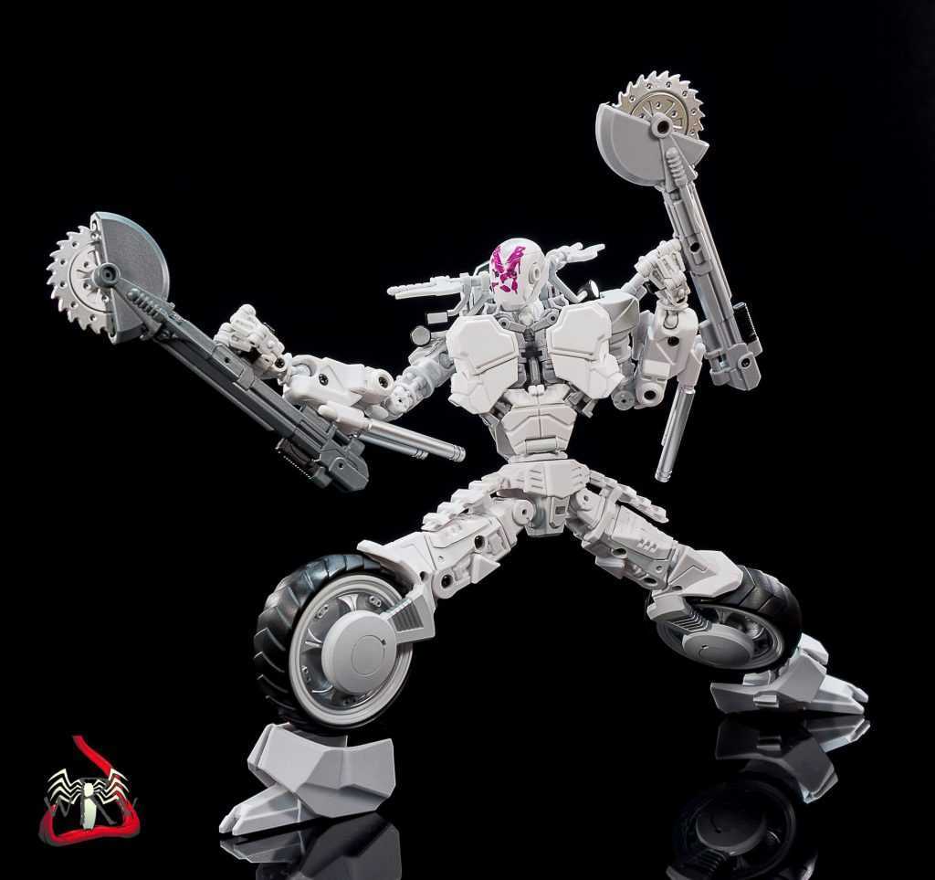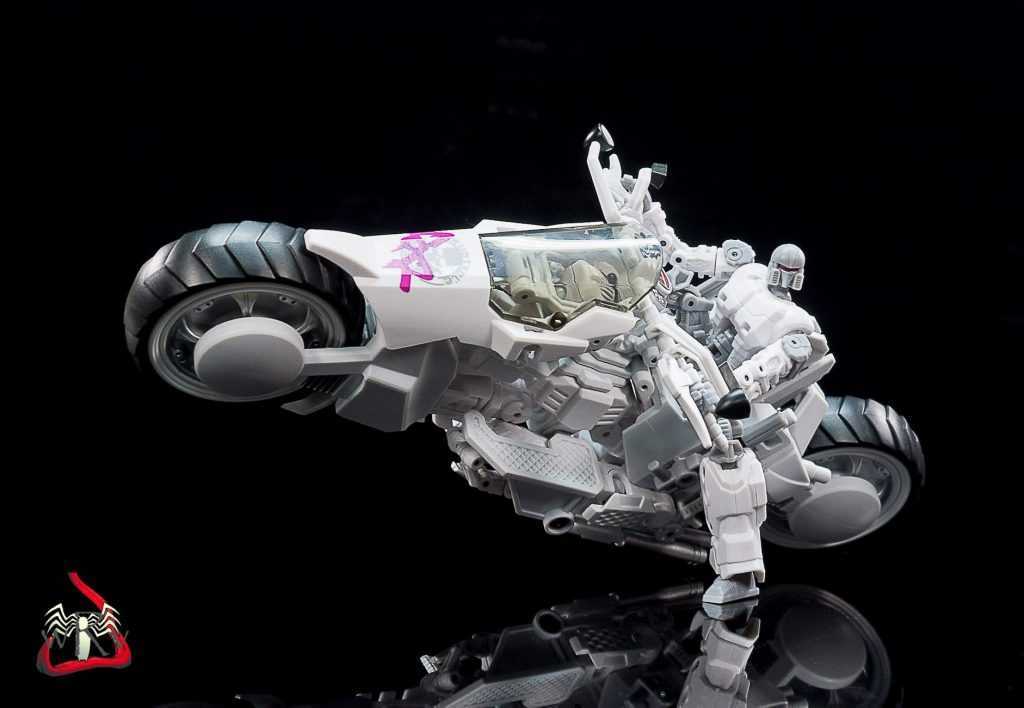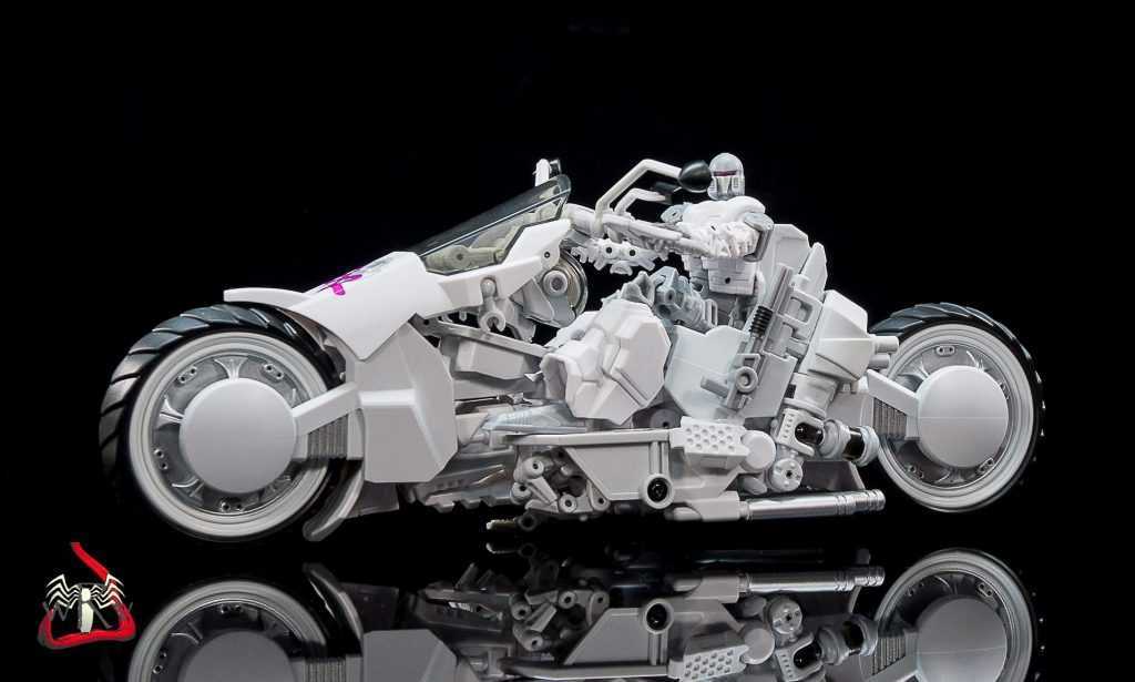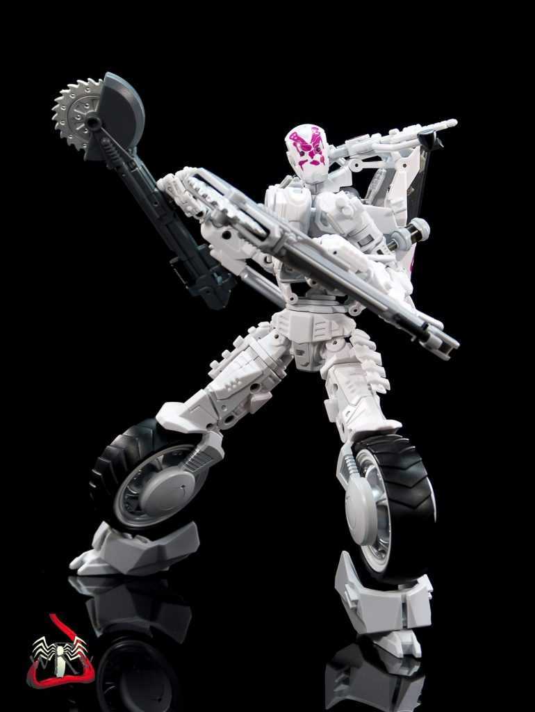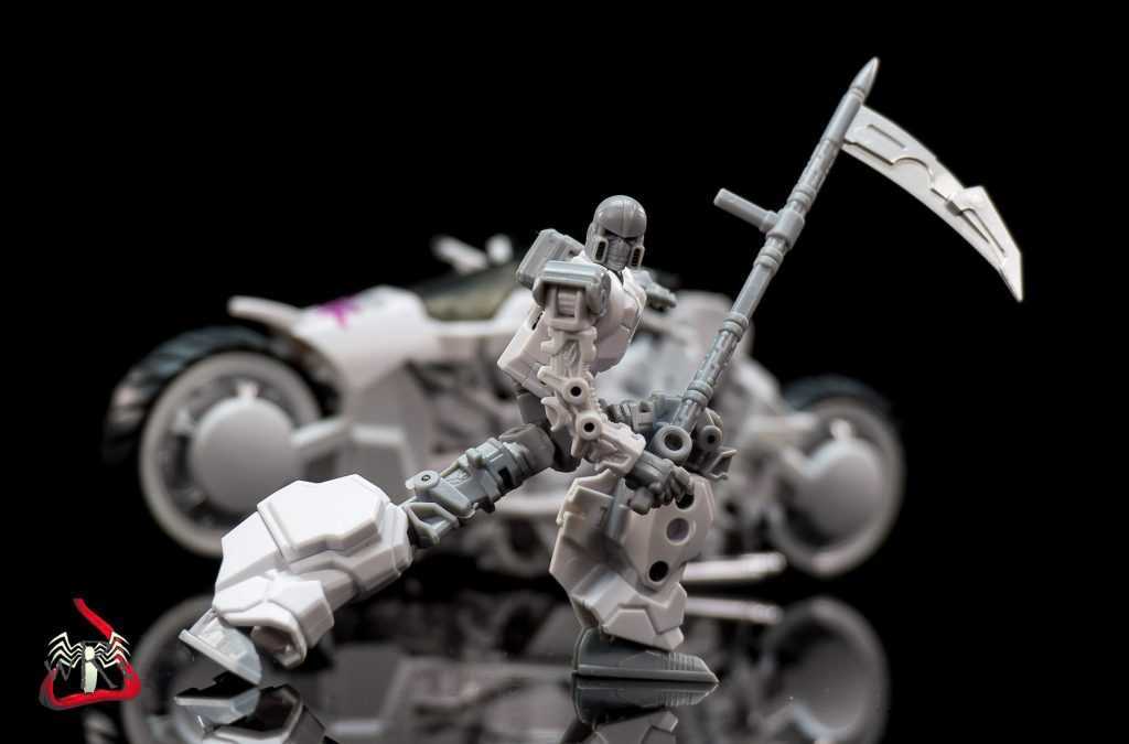 Spector Rogue/Spector General’s rider, seen above, is a much lighter white and grey, save for a little bit of purple paint in their eyes. It still has the same generic, faceplated head, but comes with a different alternate head, a skeletal face with a ridiculously exaggerated row of teeth. Instead of the smaller pistols Burley/Iride came with, this one comes with a larger pair of shotgun-like weapons (seen earlier). What’s cooler, though, is that it also comes with a big, grim-reaper style scythe, with tabs for it to wield it two-handed. The guns can still fit on the sides of the bike’s seat, and the scythe can be mounted in place of one of them, where it resembles a flying flag on the side of the bike.