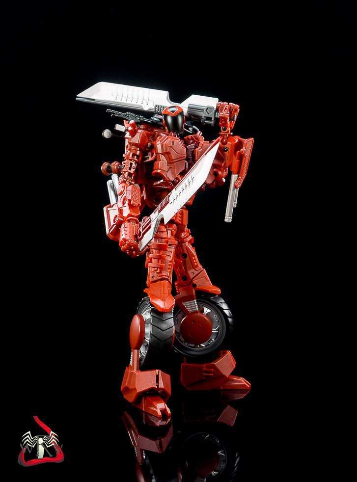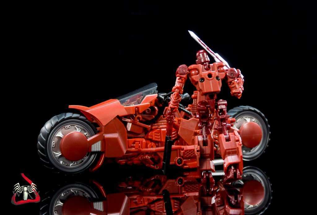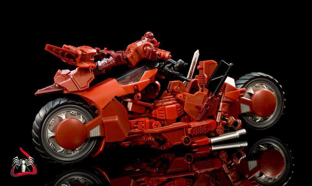 Regardless of which you pick, the figure itself consists of a motorcycle with a small robot rider. The motorcycle can then convert into a larger robot, with the rider balling up and forming a part of that larger robot’s chest. As mentioned above, Mayhem Mechanics has produced three variations on this figure: Burley/Iride and Spector Rogue/Spector General, still available from multiple online venues, and Otomo, a special, rare version only carried in a few places. Aside from having totally different color schemes, each figure has different faces and accessories, so I’ll talk about what they share in common first.