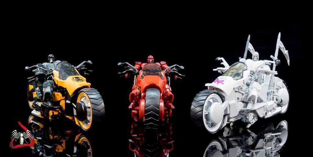 There’s some nifty twists, like the way the large robot basically does the splits to form the bike, with each wheel winding up on its thighs. Getting it back into bike mode is much more challenging, as it’s harder to collapse a figure than expand it, and there’s a lot of tabs that need to be lined up, though you’ll know when you have it, since the tabs are all very solid, and both transformations involve moments where it feels like everything pops into place at once. Still, I recommend having some big photos of the bike mode handy, or making an effort to memorize where all the parts go in bike mode. The first time I transformed one of the bikes back, I cheated a bit by pulling out another, un-transformed bike for reference to where everything was supposed to go.