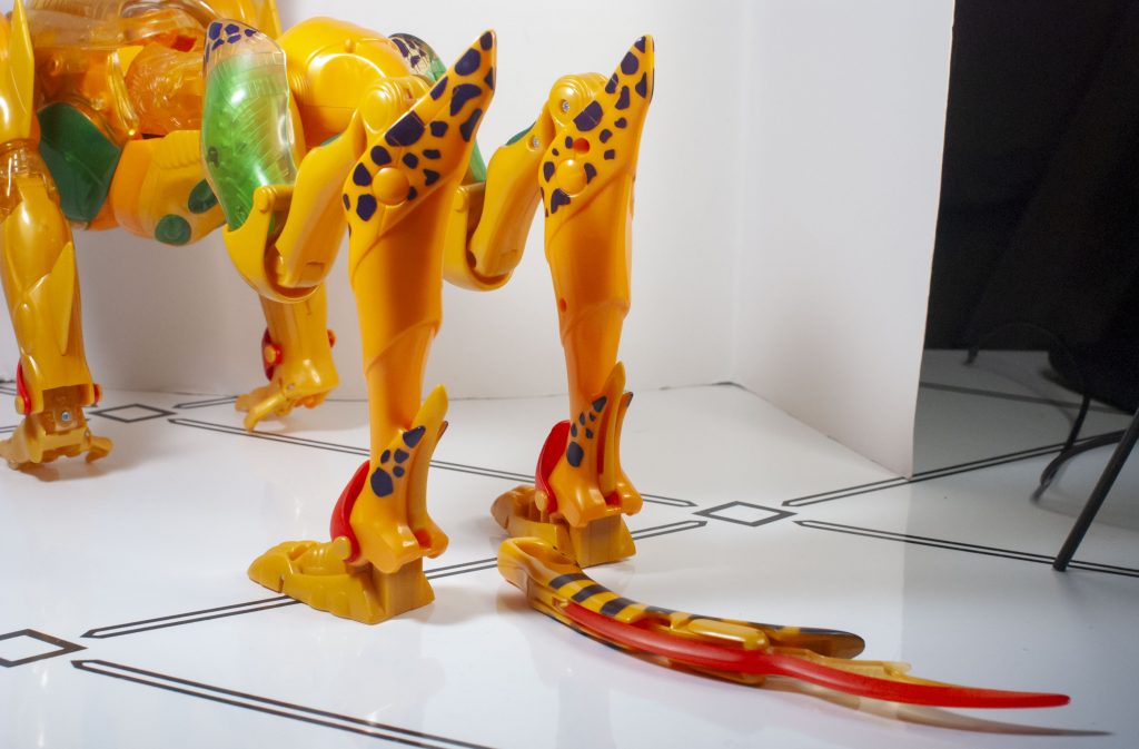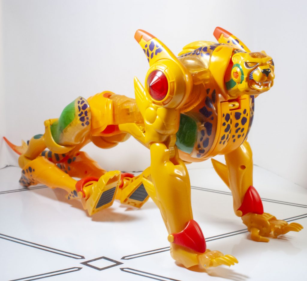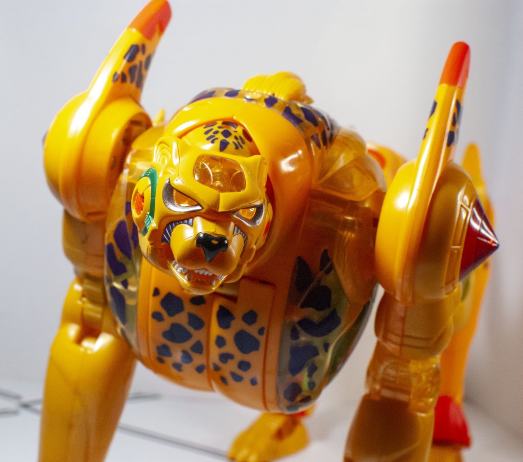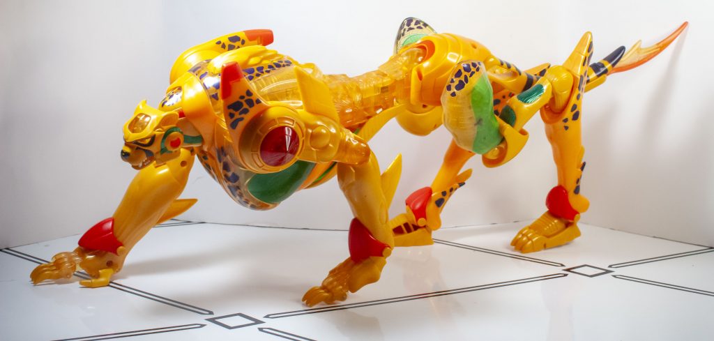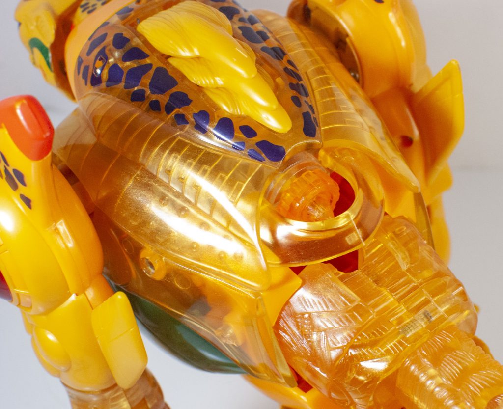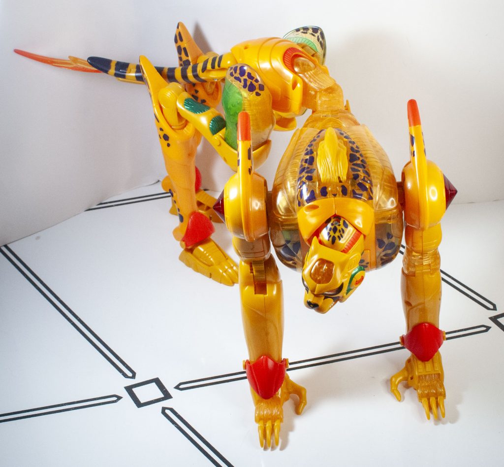 For colors, we’re looking at vast tracts of yellow, specifically a cheddary orange-yellow. It’s mostly unpainted, with only his head seeming to use paint to make the yellow. While there’s no chrome on this larger one (thankfully), he’s also maybe 1/3rd translucent yellow plastic, mostly on his back and waist. I like its use here, it makes him feel kind of high-tech. As for the rest of him, he’s got a little bit of green (both translucent and opaque) and red (ditto), plus a generous assortment of cheetah spots tampo’d on his back, shoulders, hips, knees and tail, in what seems to be very dark purple. It’s hard to call a design this abstract over or under-painted, but they seem to have done a good job with the deco.