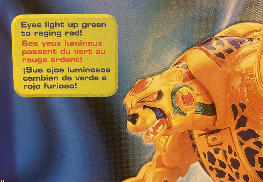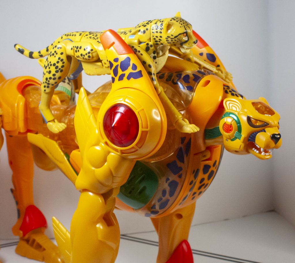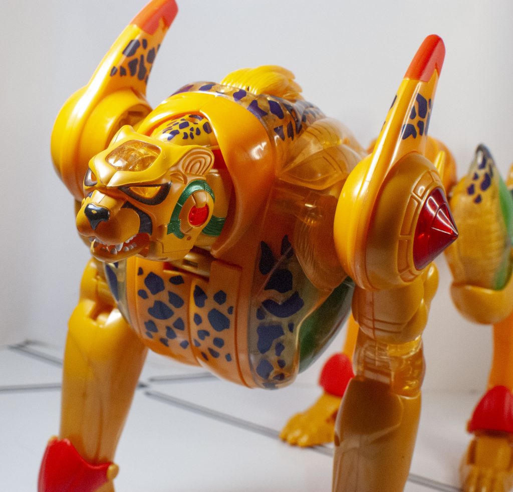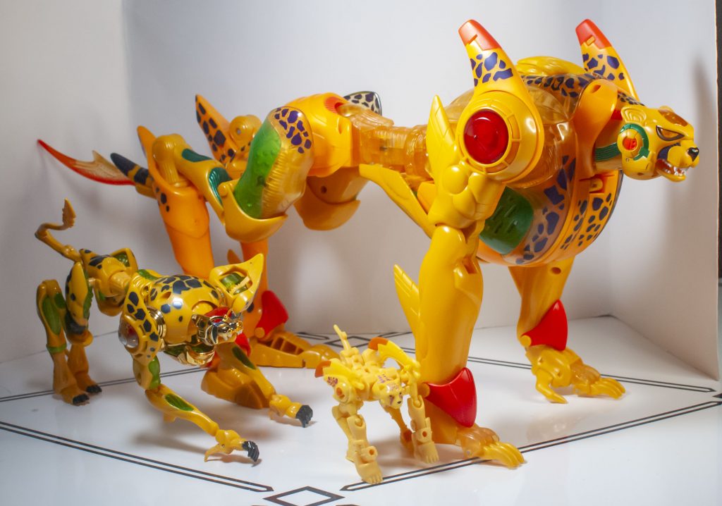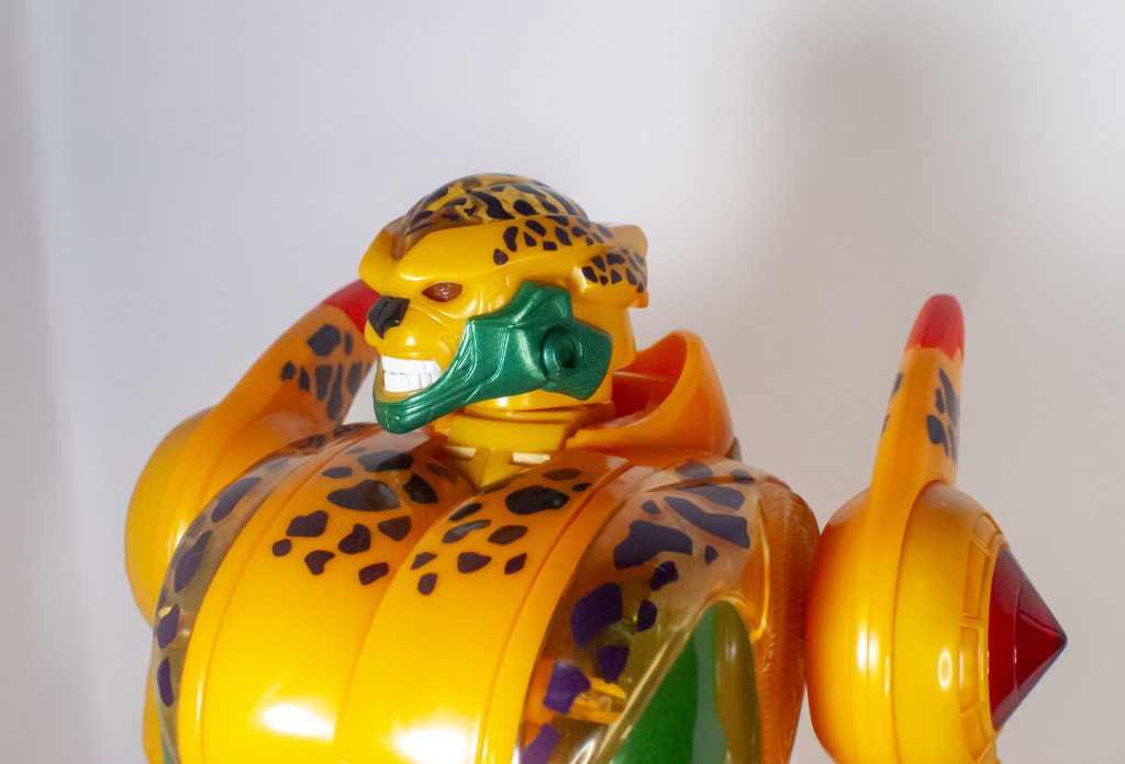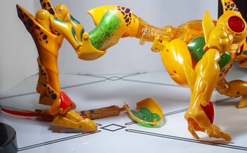 For colors, we’re looking at vast tracts of yellow, specifically a cheddary orange-yellow. It’s mostly unpainted, with only his head seeming to use paint to make the yellow. While there’s no chrome on this larger one (thankfully), he’s also maybe 1/3rd translucent yellow plastic, mostly on his back and waist. I like its use here, it makes him feel kind of high-tech. As for the rest of him, he’s got a little bit of green (both translucent and opaque) and red (ditto), plus a generous assortment of cheetah spots tampo’d on his back, shoulders, hips, knees and tail, in what seems to be very dark purple. It’s hard to call a design this abstract over or under-painted, but they seem to have done a good job with the deco.