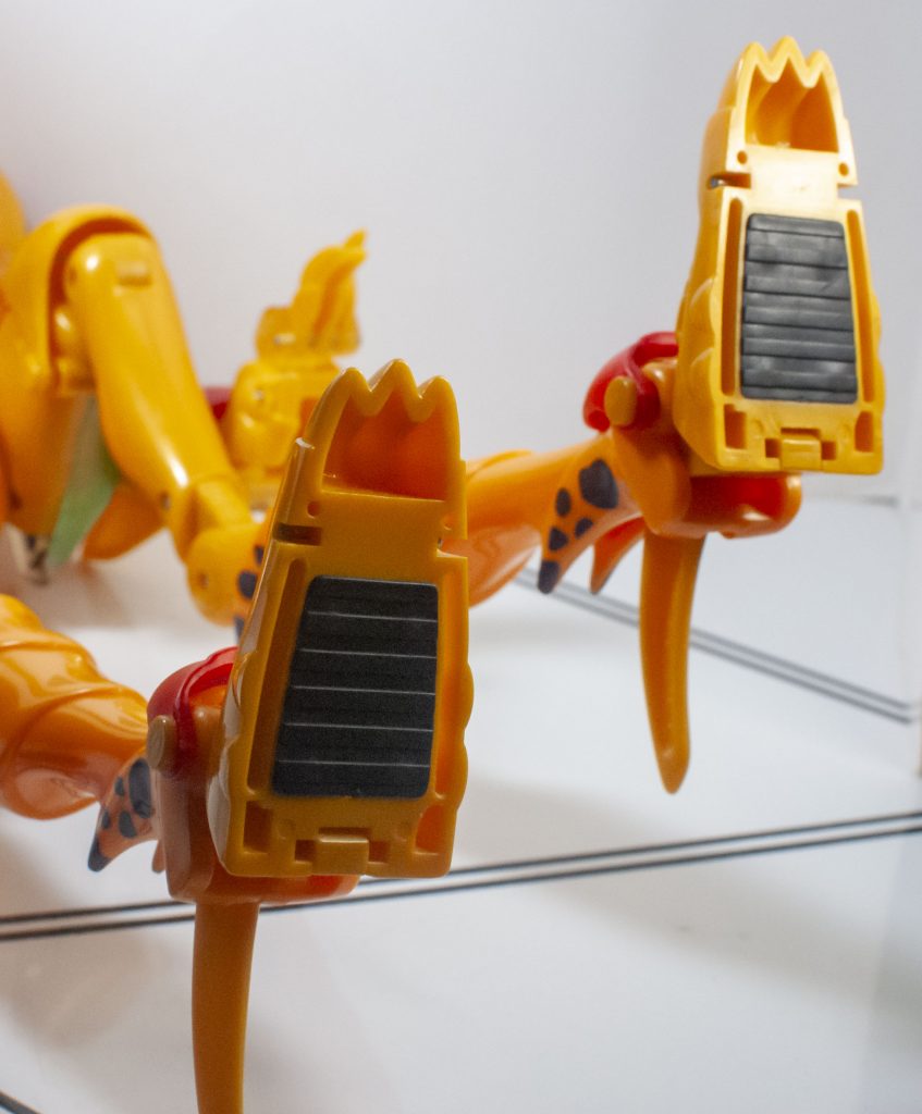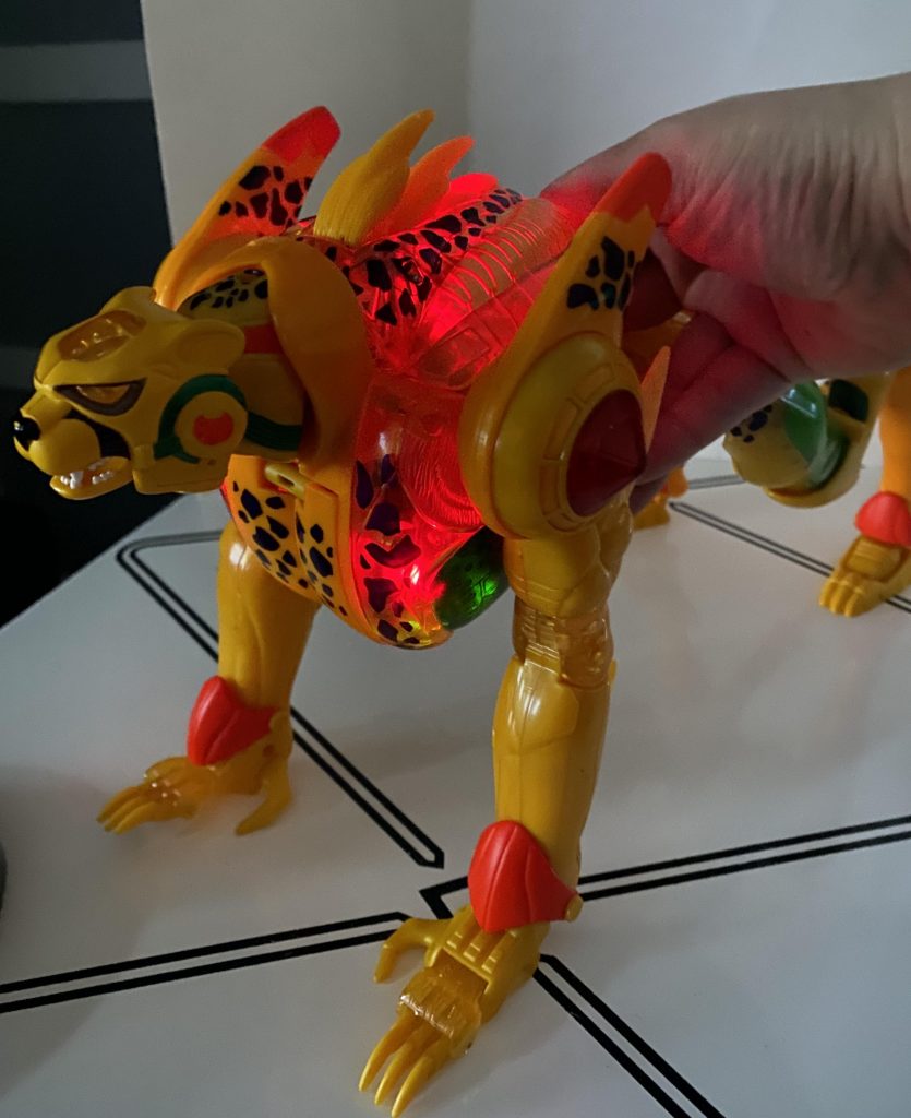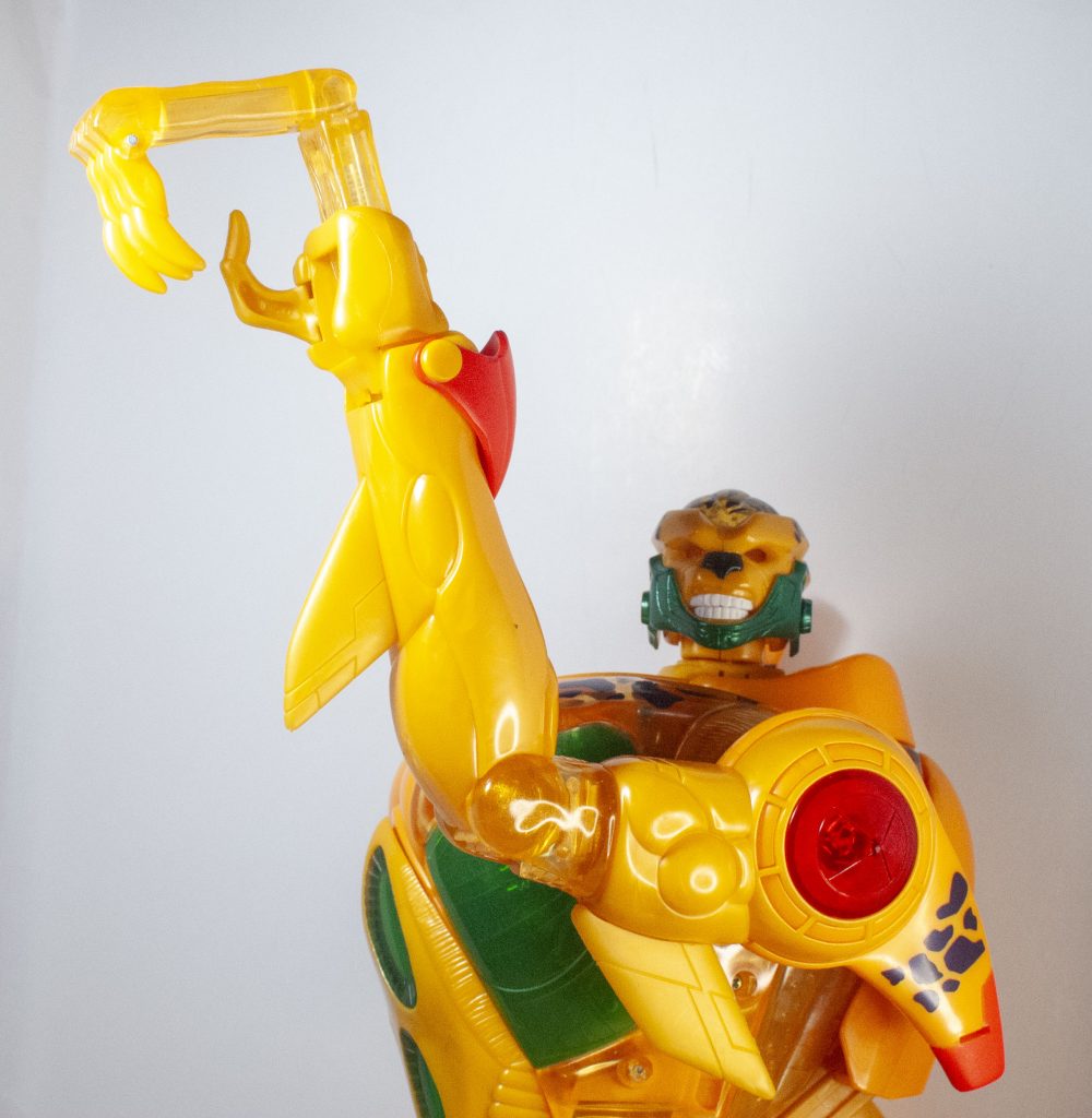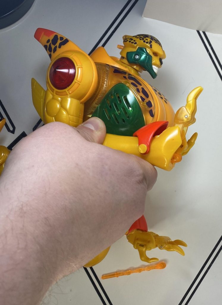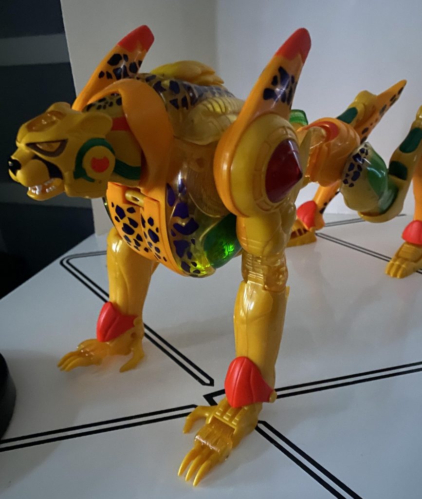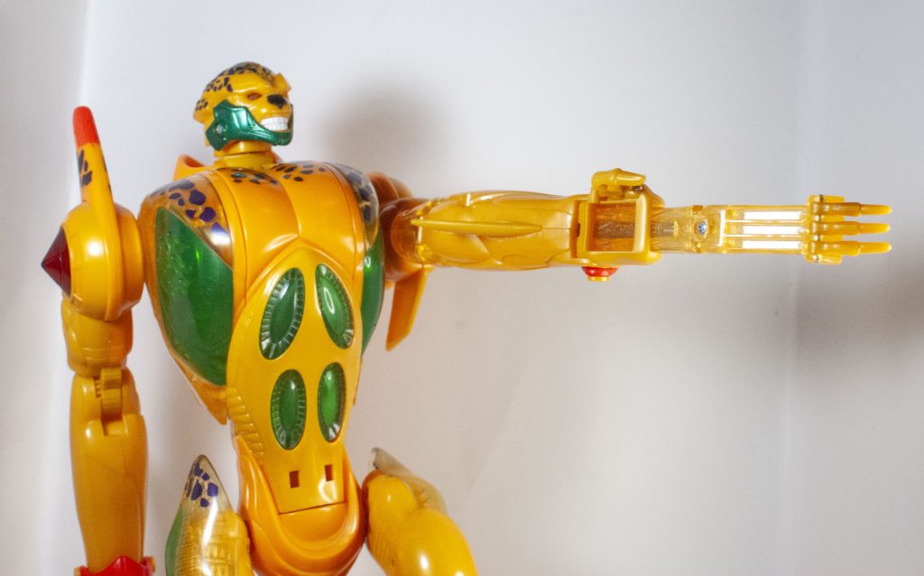 For colors, we’re looking at vast tracts of yellow, specifically a cheddary orange-yellow. It’s mostly unpainted, with only his head seeming to use paint to make the yellow. While there’s no chrome on this larger one (thankfully), he’s also maybe 1/3rd translucent yellow plastic, mostly on his back and waist. I like its use here, it makes him feel kind of high-tech. As for the rest of him, he’s got a little bit of green (both translucent and opaque) and red (ditto), plus a generous assortment of cheetah spots tampo’d on his back, shoulders, hips, knees and tail, in what seems to be very dark purple. It’s hard to call a design this abstract over or under-painted, but they seem to have done a good job with the deco.