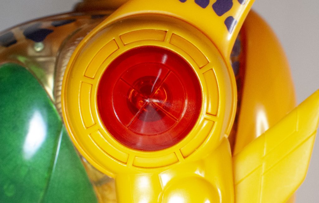 Still, it mostly works! And hey, he’s got a clear yellow panel on top of his head, so you can hold it up to a light source for lightpiping action. Speaking of his head, his other major gimmick in this mode is a geared head movement, where you spin this little turbine right above the electronics loop, to move his head from side to side, and make the mouth open and shut a little bit.