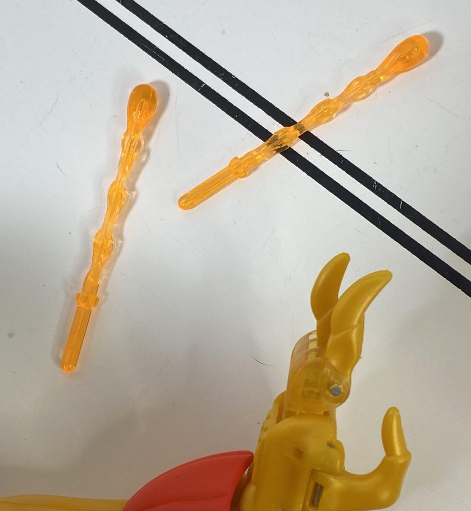 That sword is formed from his tail, by popping it out, and folding out the clear orange interior of it. A neat thing they tried to do with it is that he holds it with his fingers like a person would, by threading them through a hole in the hilt, but the way his wrist has to be tilted means he’s kind of holding it awkwardly away from him, instead of in a proper swordfighting pose. The only other real option is to swivel his bicep, and position it sideways, in front of his chest.
