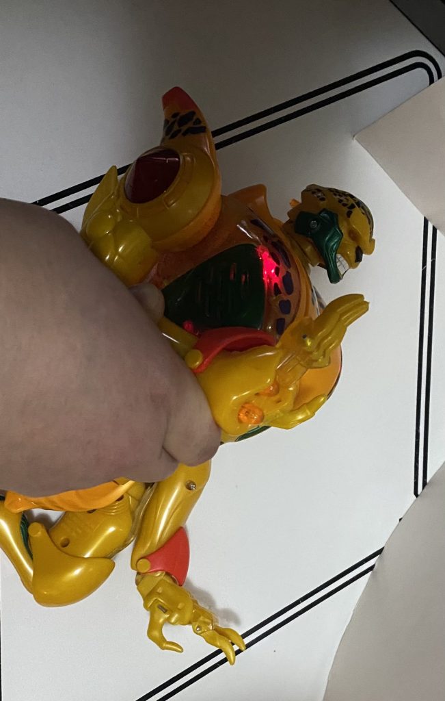 So, gimmicks, the main selling point of this superlarge toy. To start with, he’s got electronic lights and sounds, and to my great surprise, they all still worked when I tested this guy! (I should really swap out his double-A batteries, if I didn’t in the past). In this mode, the electronics are triggered by pulling a plastic loop on his back outwards.