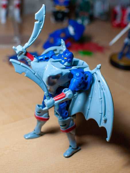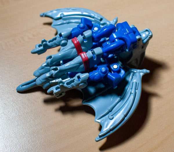 This version of Optimus changes into a blue bat, stuck in a gliding pose. His animal parts are impressively intricate, with molded details on his fur, and a well- sculpted face. He’s got zero articulation, though, aside from a movable jaw, a common thing at this size.