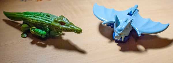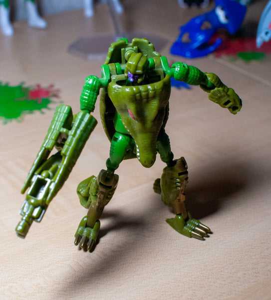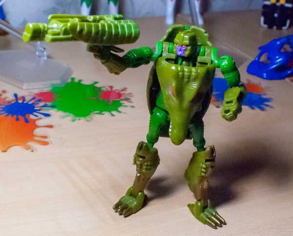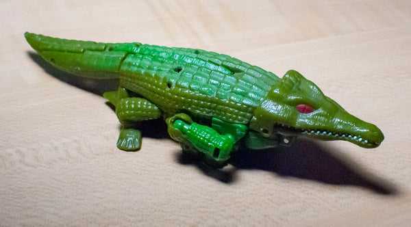 This version of Megatron changes into a nice-looking big green crocodile. He’s got less obvious robot parts in this form than Optimus, mainly confined to his robot arms and legs trying to tuck into him as best they can. Them being the same colors as his body helps. This is another very well-sculpted alternate mode, with scales, eyes, teeth, and a tongue all molded in. Once again, he’s got almost no poseability except for his jaw. A confession, though: The way he looks when you flap his jaw open amuses me for some reason. He’s just so happy.