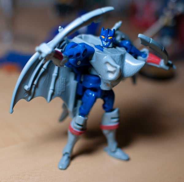 This guy’s a fusion of Batman and Optimus, 100 per cent, straight up. His headsculpt in particular contains the typical Optimus mouthplate, antennas and forehead vent, but it’s angular, shaped like Batman’s cowl. Combine that with the wings on his back, and you’ve got yourself a tasty homage. Outside of that, he’s got the typical-for-the-time beast head on his chest. He’s also got the same colors, with some painted red stripes on his arms and legs that pop against the blue.
