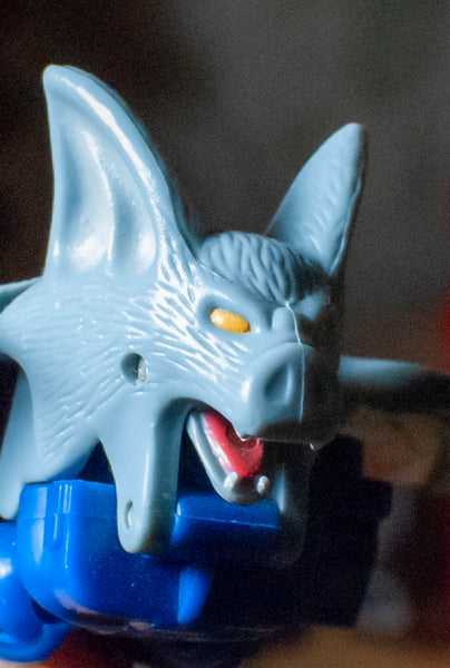 He’s baby blue, with his robot bits being dark blue. Like so many 90’s action figures, he has monochrome yellow eyes instead of pupils. Shout out to him having painted teeth and a tongue, though, which you don’t see much of these days.