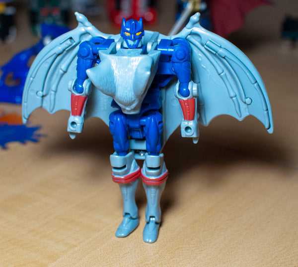 This guy’s a fusion of Batman and Optimus, 100 per cent, straight up. His headsculpt in particular contains the typical Optimus mouthplate, antennas and forehead vent, but it’s angular, shaped like Batman’s cowl. Combine that with the wings on his back, and you’ve got yourself a tasty homage. Outside of that, he’s got the typical-for-the-time beast head on his chest. He’s also got the same colors, with some painted red stripes on his arms and legs that pop against the blue.