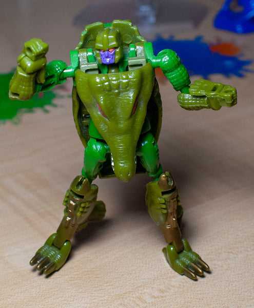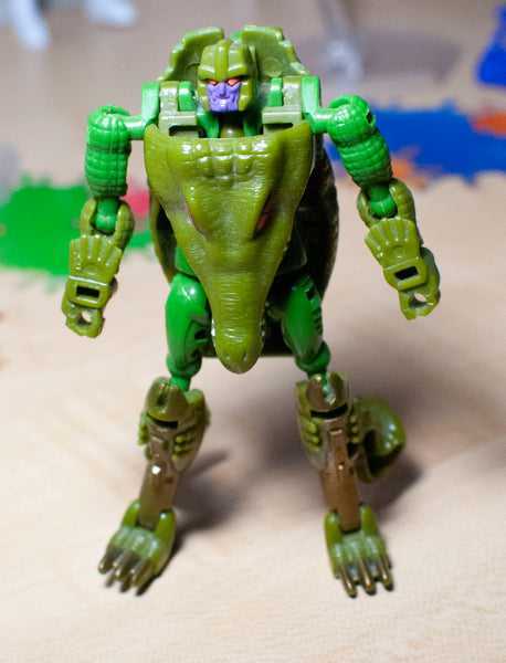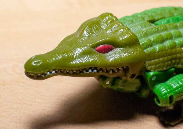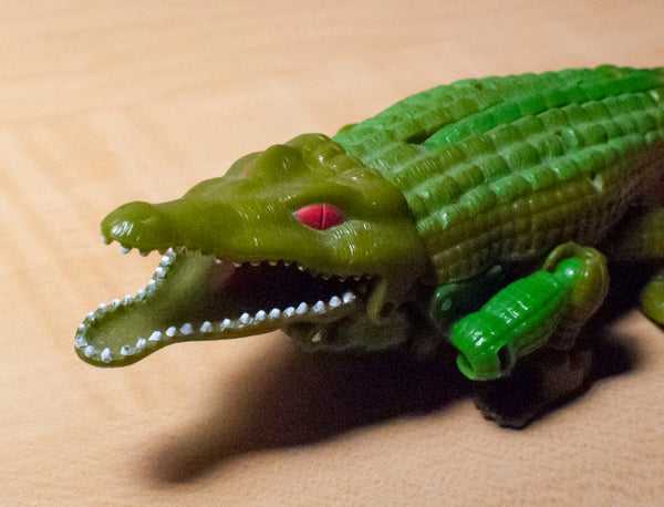 This version of Megatron changes into a nice-looking big green crocodile. He’s got less obvious robot parts in this form than Optimus, mainly confined to his robot arms and legs trying to tuck into him as best they can. Them being the same colors as his body helps. This is another very well-sculpted alternate mode, with scales, eyes, teeth, and a tongue all molded in. Once again, he’s got almost no poseability except for his jaw. A confession, though: The way he looks when you flap his jaw open amuses me for some reason. He’s just so happy.