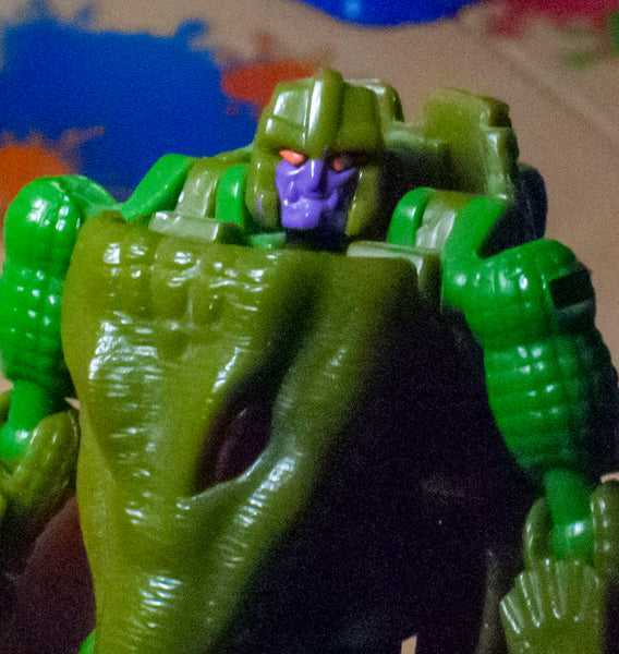 This Megatron’s a muscular, organic-looking robot, thanks to the scale patterns on his body, though his robotic lower legs make it look like he’s got boots on. He’s got a tiny bit of kibble on his lower legs, in the form of his alligator feet, but mostly makes for a clean robot. His head has a nearly-identical sculpt to the larger Beast Wars Megatron, but with the addition of tusks coming out of his mouth.