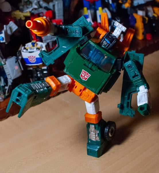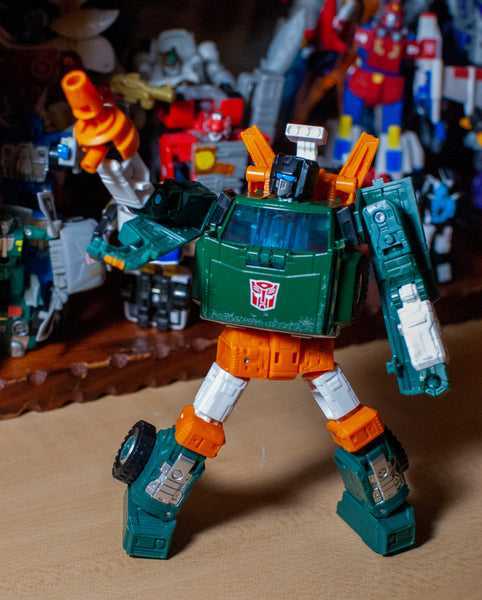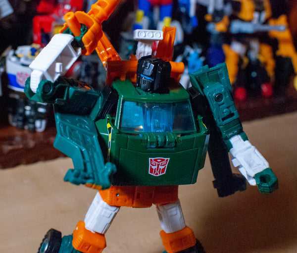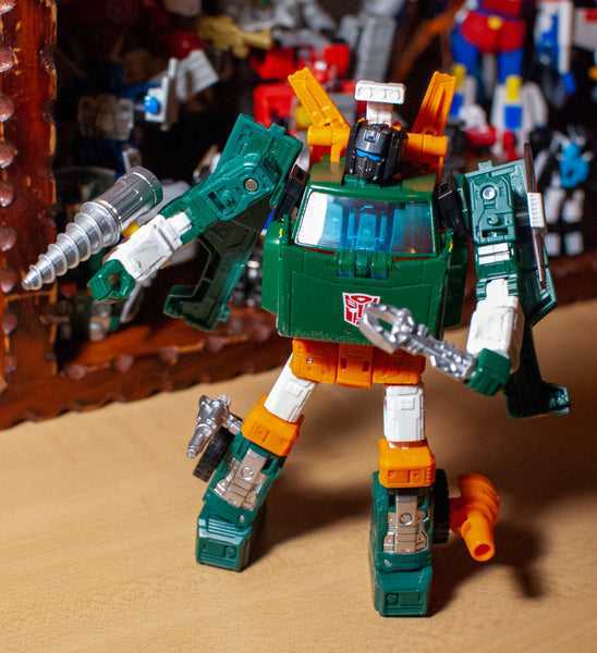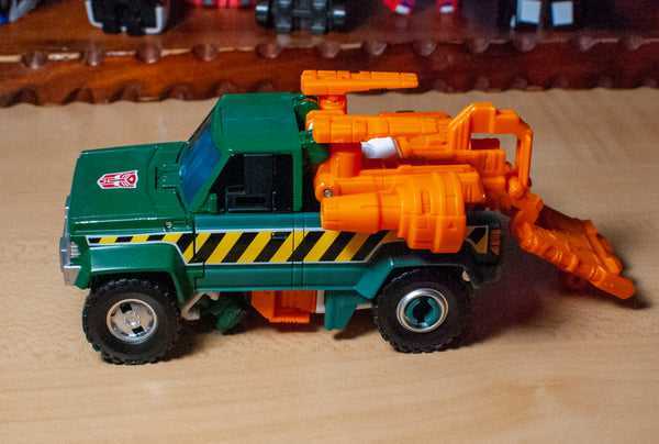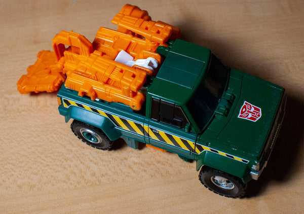 His one accessory is an orange cone-like device, a missile on the original toy, but something that really looks like more of a wielder and repair tool. It’s meant to slide over his wrist and replace one of his hands, as seen in the G1 Cartoon’s animation, though it’s still obviously handheld from below. He’s got additional mounting points on his lower legs (two on each,) arms (also two on each), and on his back, but it feels inappropriate equipping him with Siege weapons. This is a bot that needs to be decked out in repair tools.