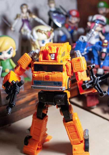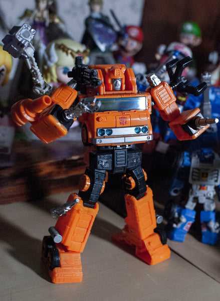 For his colors, he’s cheddar-cheese orange, in a construction-toy way. But unlike Cyberverse Hot Rod, his main color doesn’t overwhelm too much, with there being just enough of a color mixture to break it up, thanks to his black parts, his nice silver paint, and the little bits of clear blue here and there. Plus, it’s a nice shade that shows off plenty of sculpted detail.