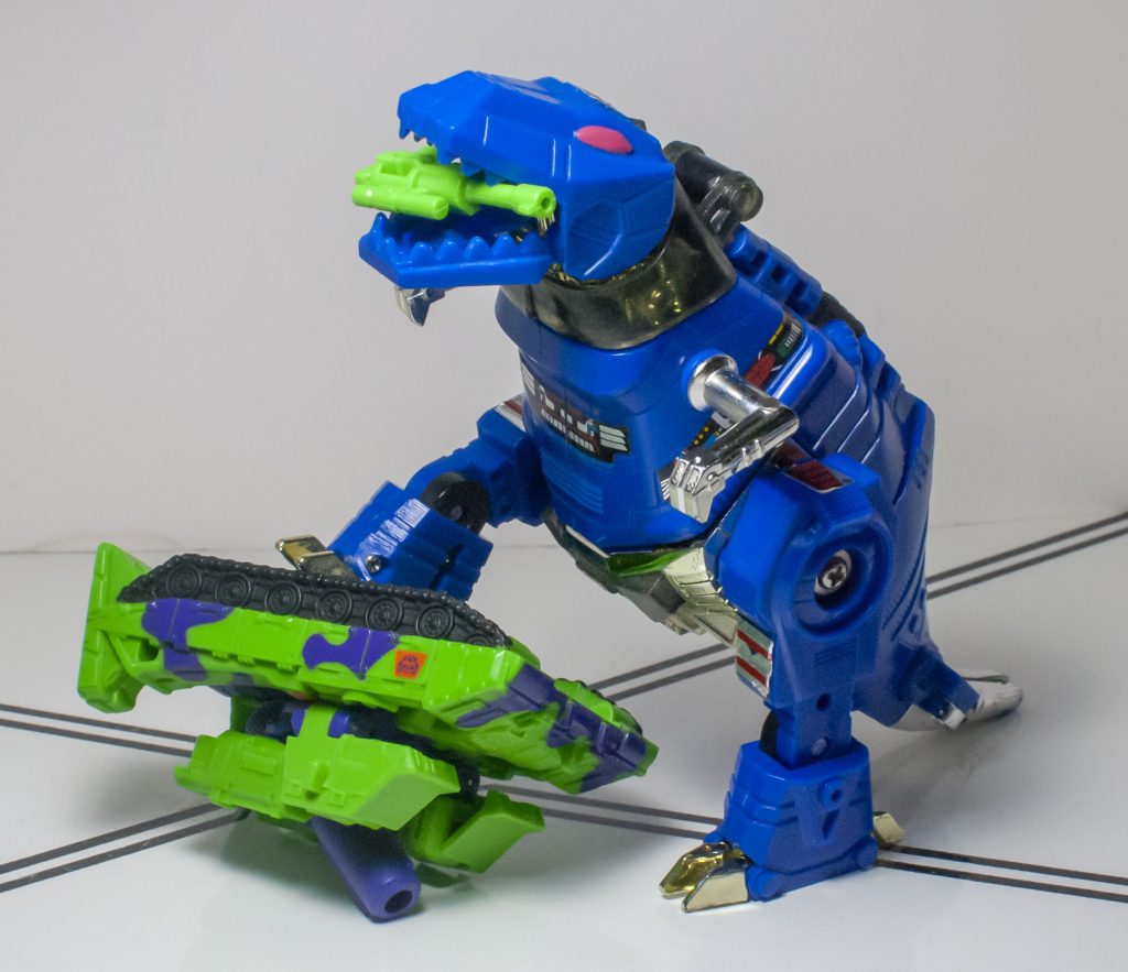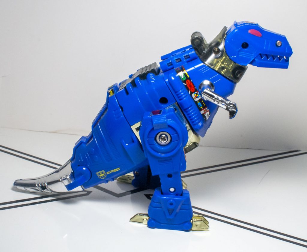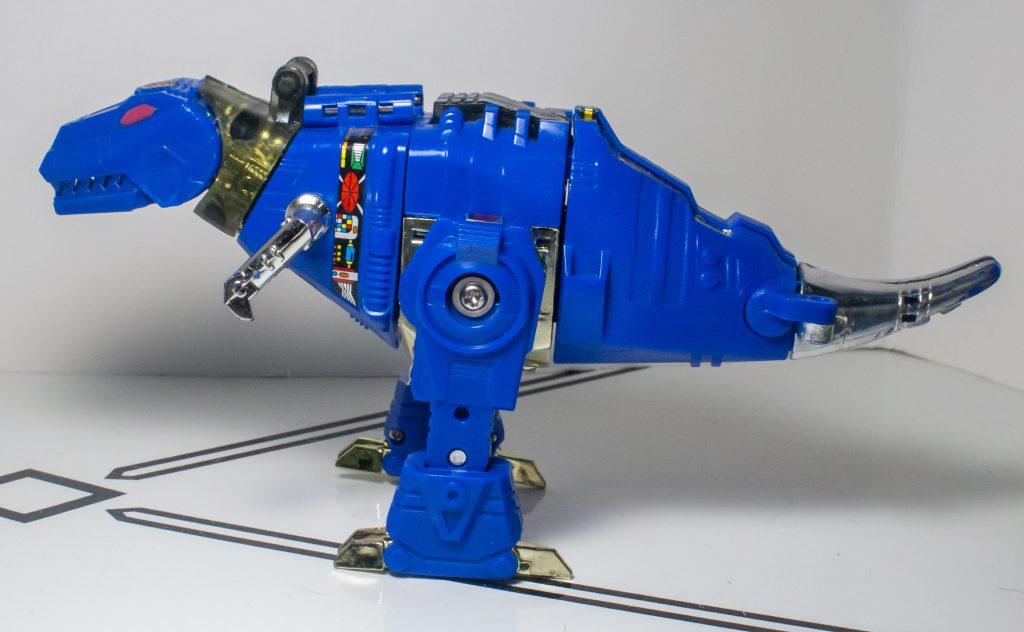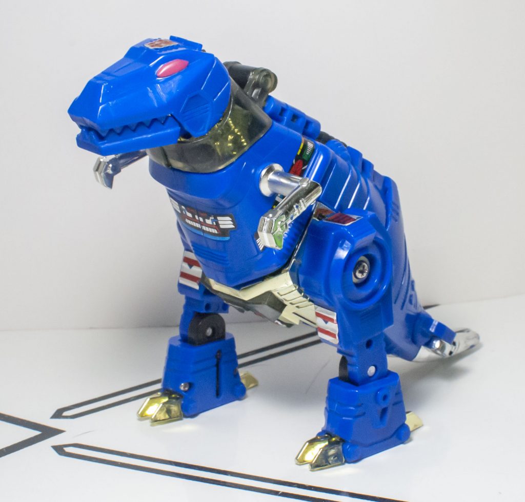 His build quality in this mode’s got ups and downs. That loose dino hip joint’s now his shoulder joint, which is a plus, and his robot legs are much tighter. On the other hand, he’s a back-heavy figure without much in the way of heel spurs, so I find it challenging to keep him standing up, and he’s prone to falling backwards if the table he’s on shakes.