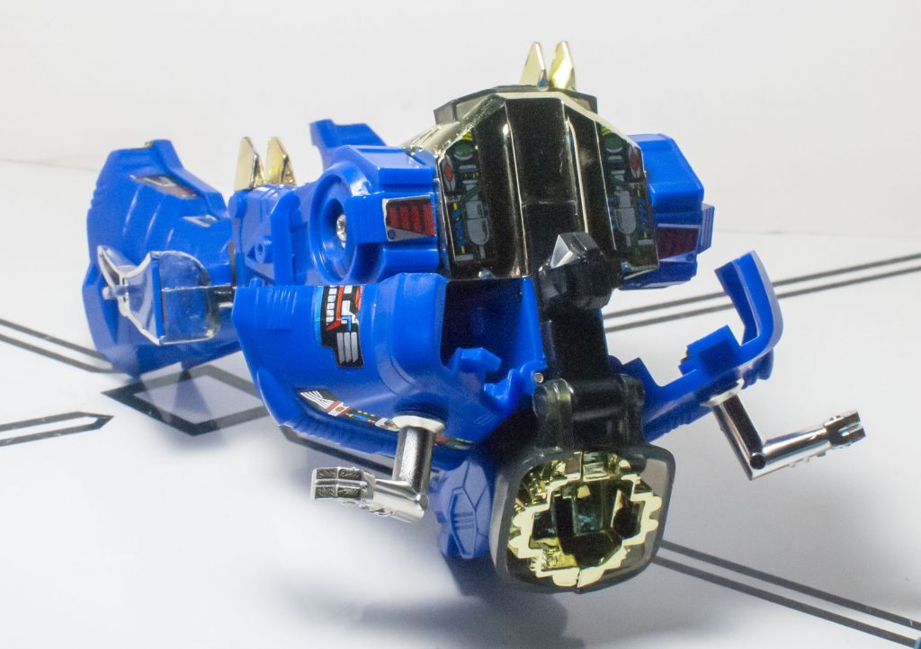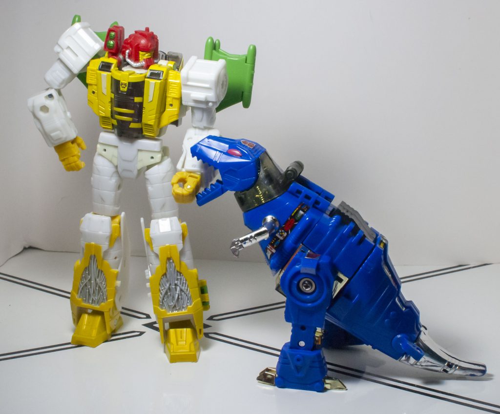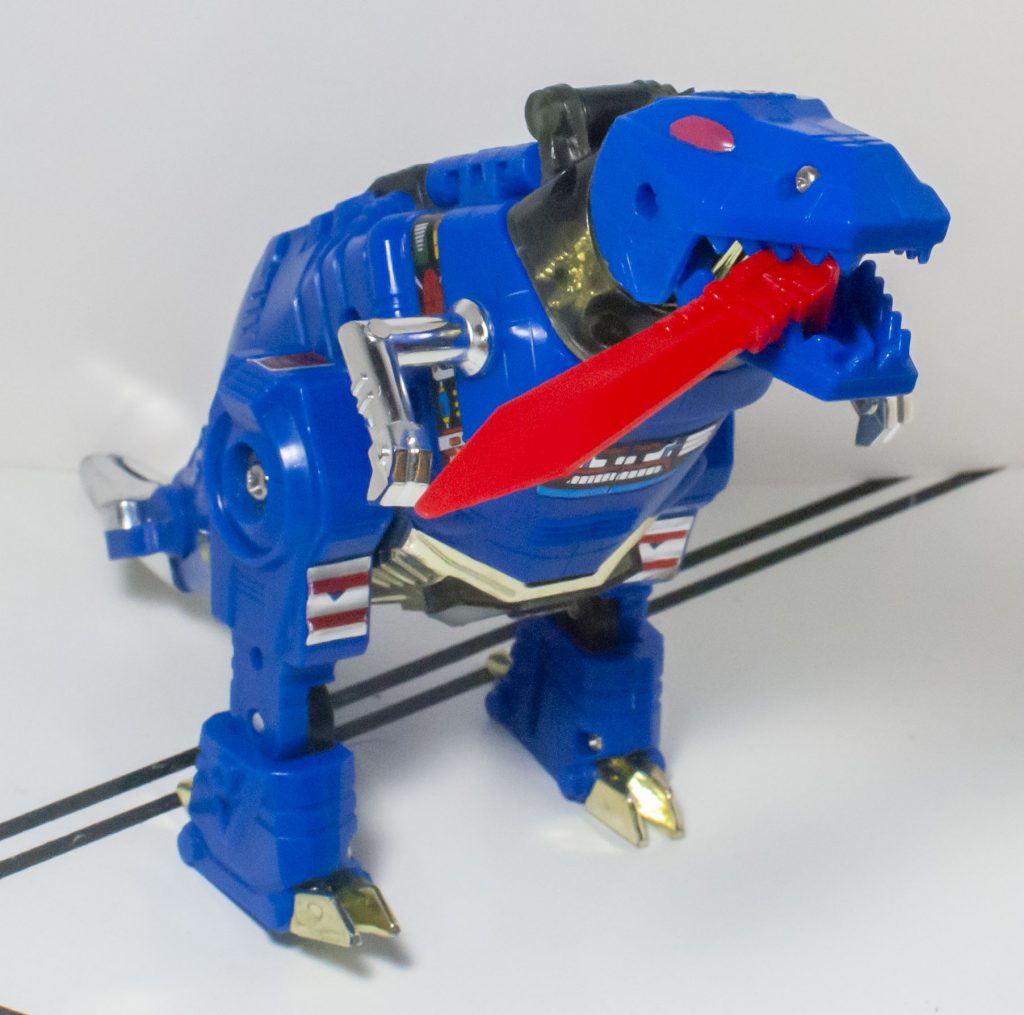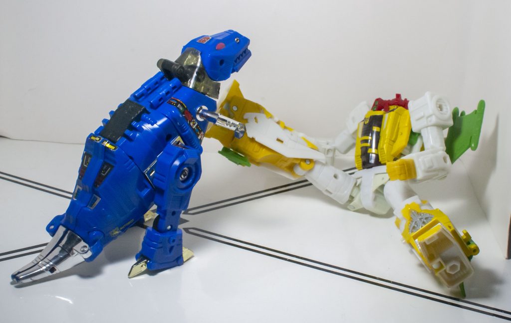 His build quality in this mode’s got ups and downs. That loose dino hip joint’s now his shoulder joint, which is a plus, and his robot legs are much tighter. On the other hand, he’s a back-heavy figure without much in the way of heel spurs, so I find it challenging to keep him standing up, and he’s prone to falling backwards if the table he’s on shakes.