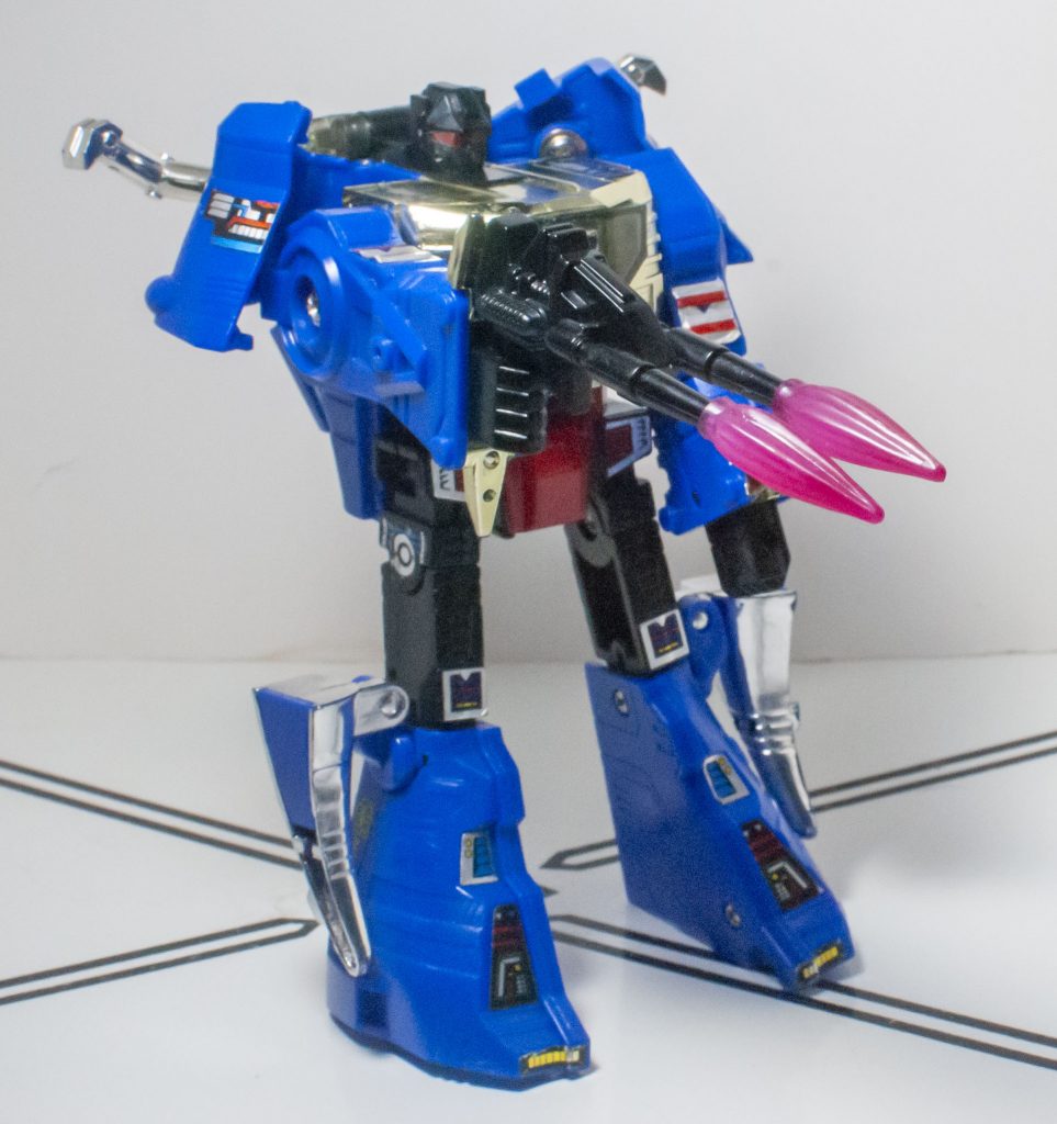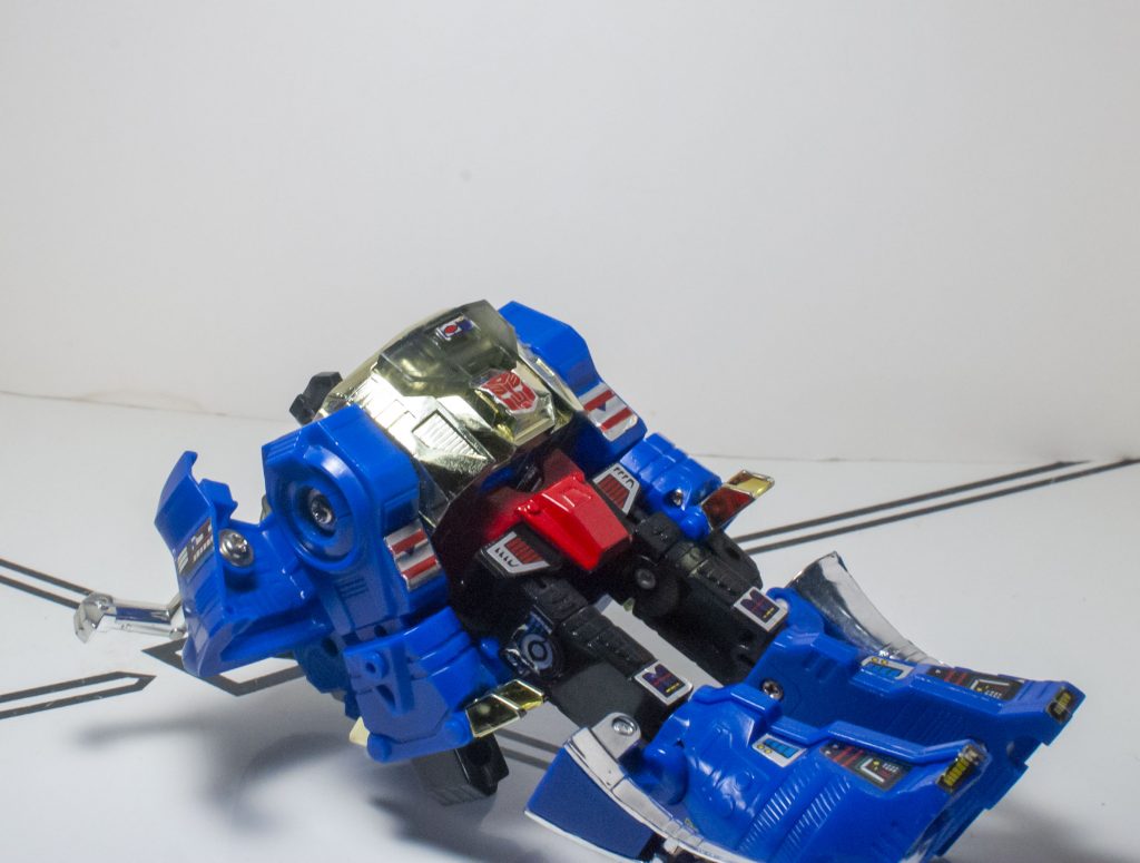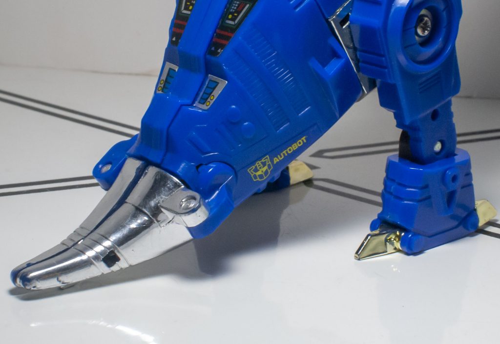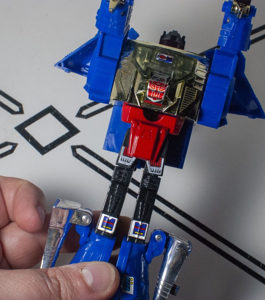 That said, it’s just a nice shade of blue in person, and I like it on its own merits. The only other bit of deco this Generation 2 version added was a yellow G2 Autobot symbol on his tail, along with the word “Autobot,” also in yellow, something nearly every G2 figure had on them (and the only way to tell the silver version apart from a vintage G1 release).