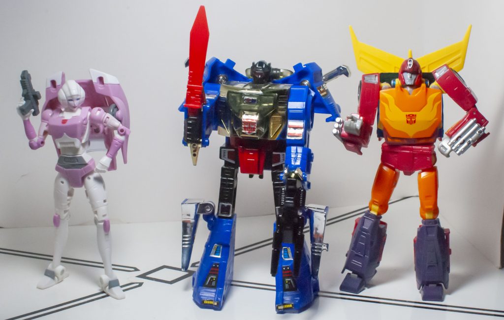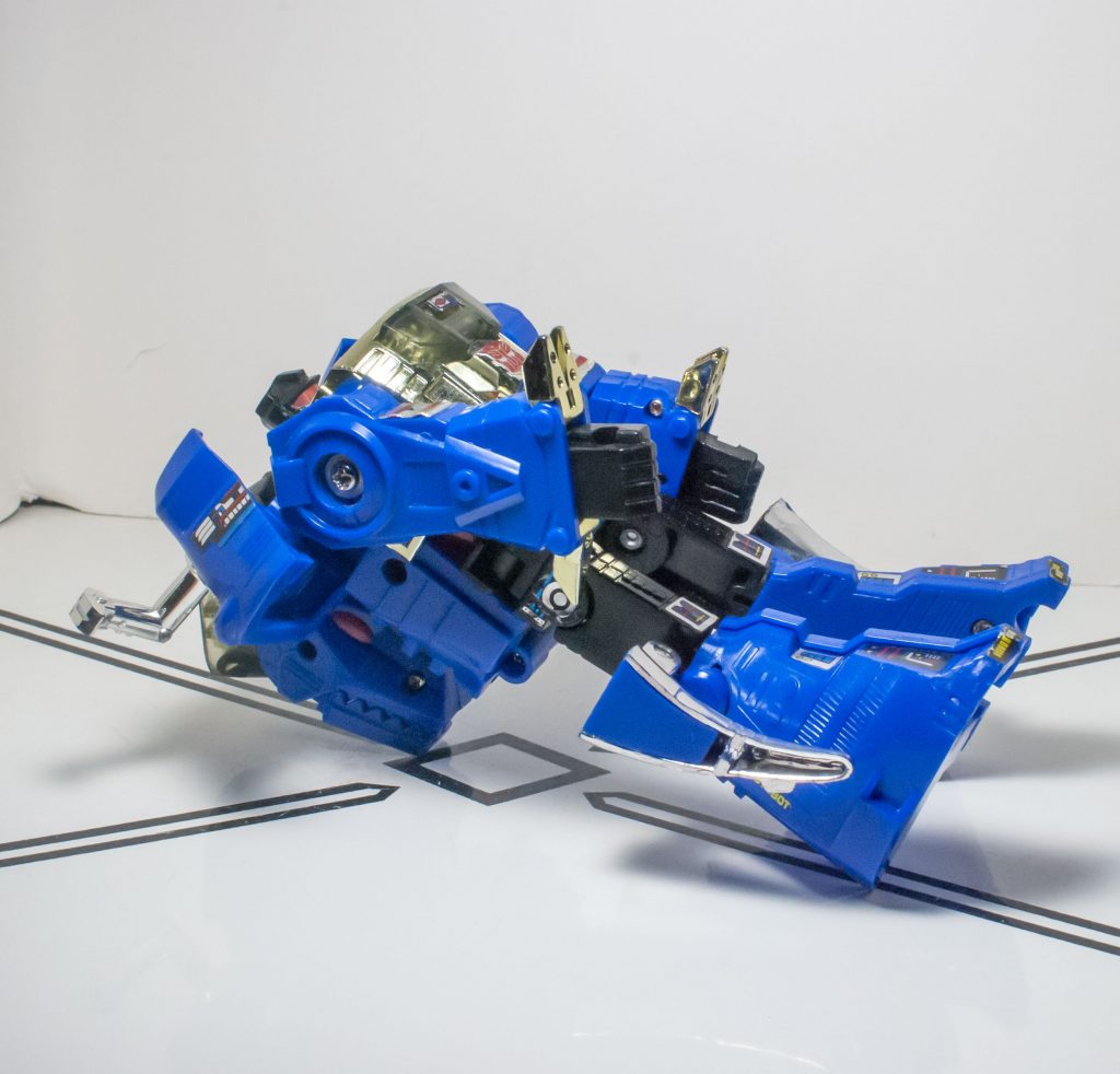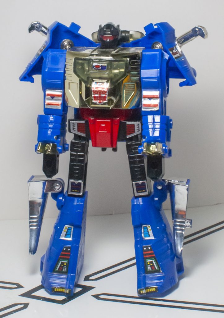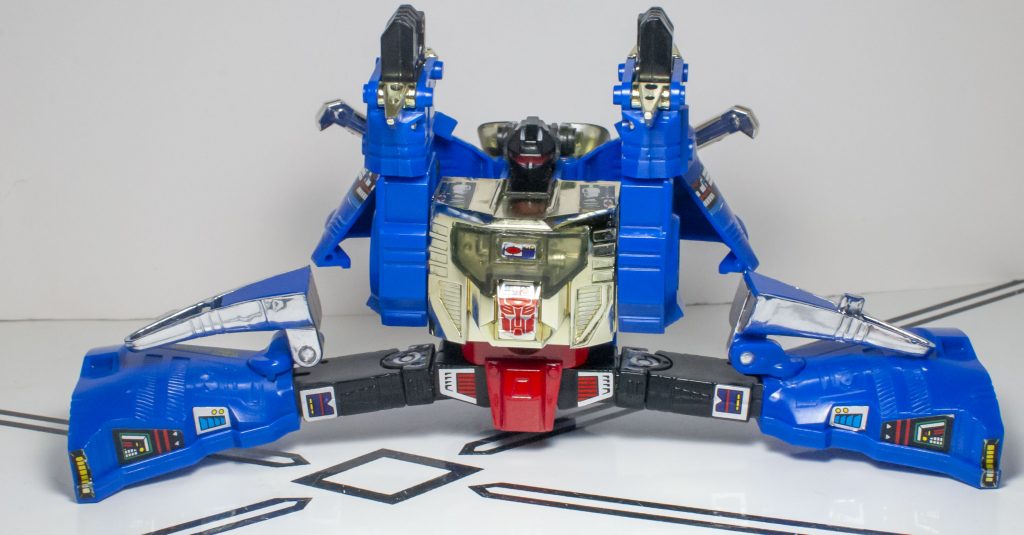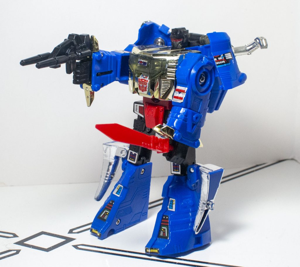 That said, it’s just a nice shade of blue in person, and I like it on its own merits. The only other bit of deco this Generation 2 version added was a yellow G2 Autobot symbol on his tail, along with the word “Autobot,” also in yellow, something nearly every G2 figure had on them (and the only way to tell the silver version apart from a vintage G1 release).