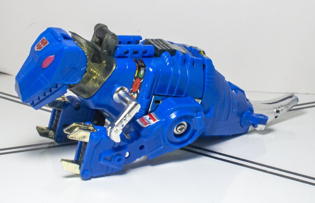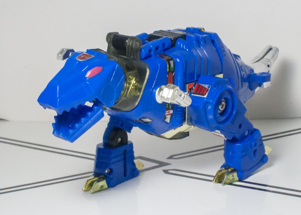 As for the colors, while Generation 2 was known for gaudy, bright excesses, that wasn’t really the case here. Basically, they just swapped his main color of metallic silvery-gray for a tasteful dark, navy blue. Just so no one um-actually’s me, I’ll also note that this is the third version of Grimlock they did during Generation 2. In G2’s first year, Hasbro were really into doing color variants (like the red and yellow Bumblebees and Cliffjumpers in Generation 1), so they initially released Grimlock in his usual silver, before switching it up to a light blue in later waves, and then finally, this dark blue. This version’s the most common of the three color schemes (and therefore the cheapest on the aftermarket).
