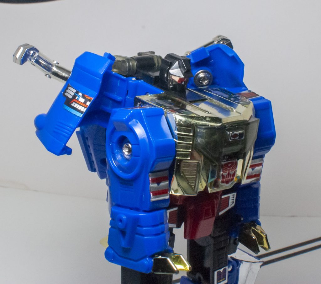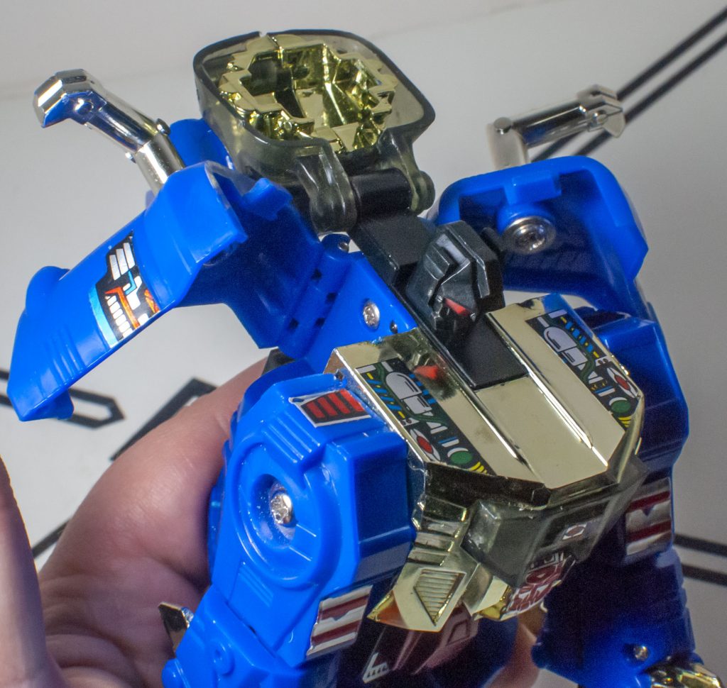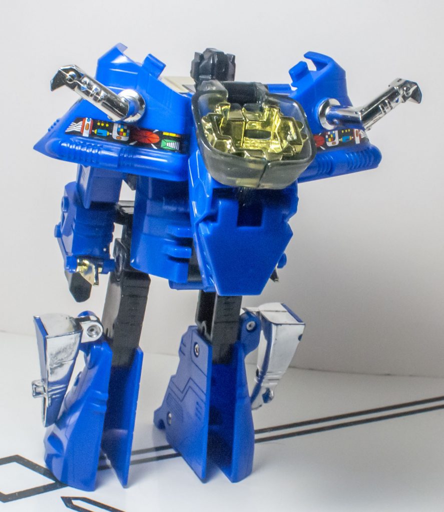 But he does have one curious little undocumented extra: The smokey clear panel on his back can flip out and up, into a cockpit chair, intended for a Diaclone minifigure, back when this figure was supposed to represent a piloted mecha.