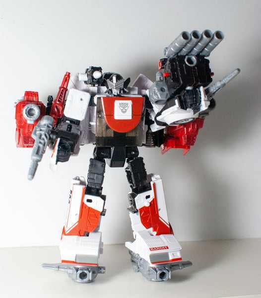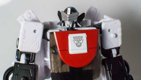 For colors, Exhaust is mostly white, dark red and black. He’s got some silver here and there, including his face, and smokey transparent windows on his chest, too. Apparently, despite the subtle cigarette theme, he’s whiter than Wheeljack. Overall, though, it’s kind of a muted color scheme, thanks to the dark red. I kind of wish he had some blue on his chest windows and wings, like the Masterpiece or the original toy had, to add some more vibrancy, because as it is, he’s a bit plain.