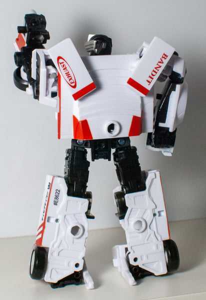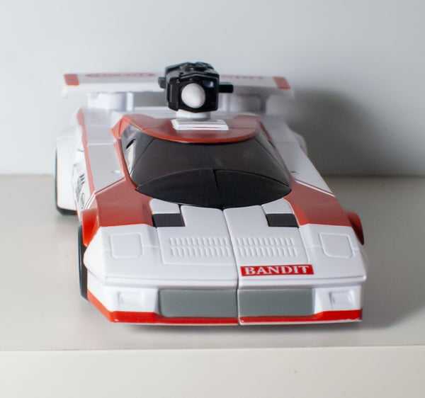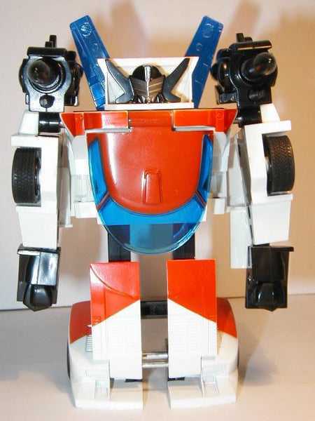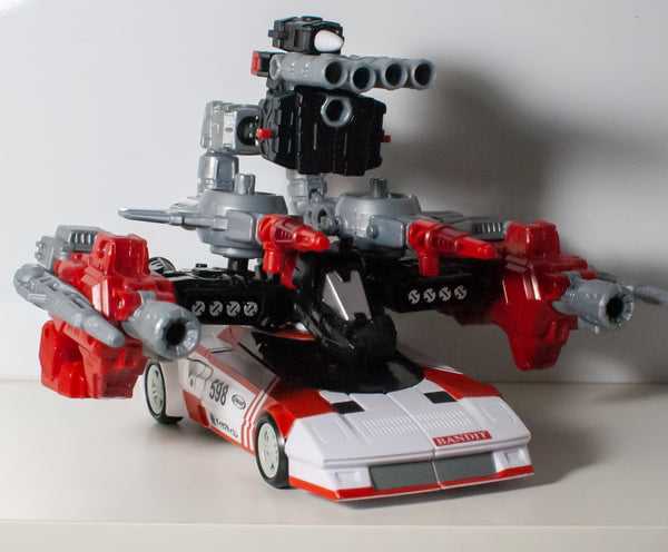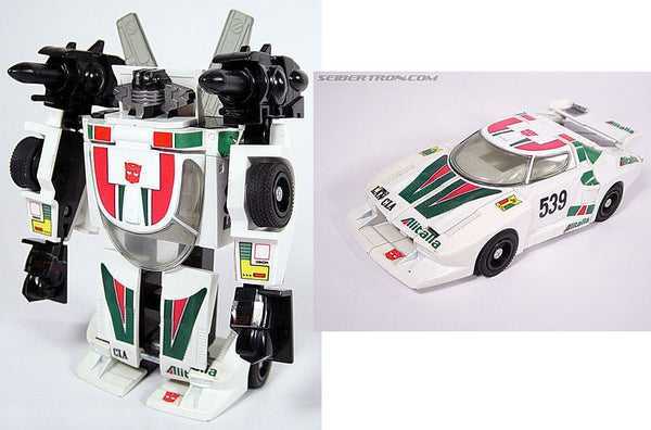 Exhaust transforms into a fairly sleek-looking racecar, with a spoiler in the back, and a wraparound cockpit. It’s not quite the original Lancia Stratos, thanks to licensing, but it’s close enough, and looks like something you’d see on a racetrack.