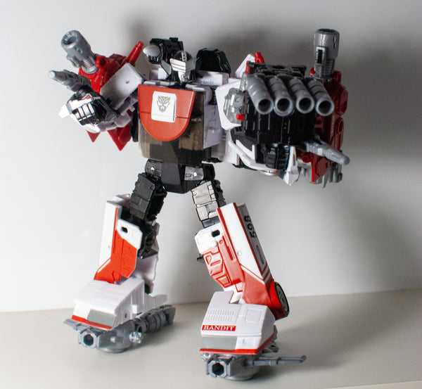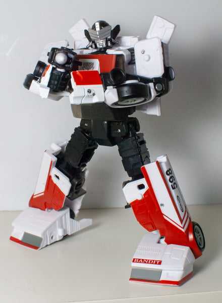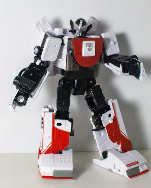 Exhaust has a lot less livery on him than Wheeljack, but they still found room for a bunch of easter eggs with his tampos, which, according to Twitter, are almost all sneaky cigarette references. Aside from the two “Bandits” in red on his body, which are a cigarette brand on top of a movie reference, there’s also a 7 surrounded by dice (a reference to Lucky 7, another brand), and a little crown with “royal” underneath, which could be a reference to the whiskey, but is also yet another cigarette brand. Outside of that, we have the original toy’s 598 number (the same number as the real car this started as), the phrase “Decepticon” in Japanese characters, and, amusingly, his name misspelled as “Exhuast.” There’s been some debate about whether or not this was a genuine error, or a sneaky reference to how the original intentionally misspelled “Marlboro” as “Marlboor” to dodge copyright. Either way, it’s kind of funny, and I dig it.