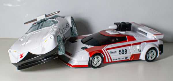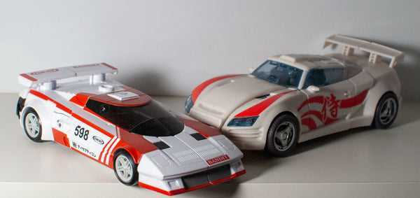 There was some legal trouble with Marlboro when the Masterpiece version of Exhaust came out, thanks to the car’s real-life deco looking like a carton of Marlboro cigarettes, so while he still has the original racecar’s colors, they’re laid out in a totally different way compared to both previous toys. Considering how different they had to be, they did find a pretty slick-looking layout for the red on him. Even the black squares of black plastic on his hood look like something that could plausibly be a part of a racing deco.