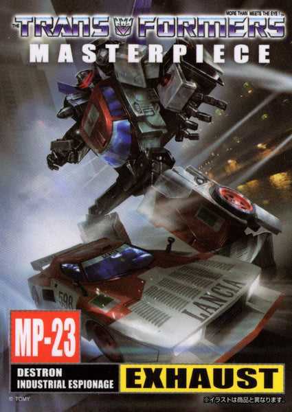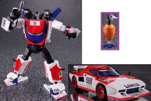 The Diaclone toy that would become the original Wheeljack had an alternate version released (pictured above), with a different head, transforming into a Lancia Stratos racecar mode based on a specific real-life car that was, amusingly, sponsored by Marlboro Cigarettes, misspelled “Marlboor” on the toy to dodge copyright. This “Marlboor Wheeljack” never got a Transformers release, and was a neat bit of trivia until 2015, when Takara decided to retool their recent Masterpiece Wheeljack figure into it, giving him a name and bio note, as the Decepticon Exhaust, his name a play on the original toy’s cigarette sponsorship.