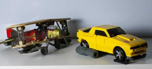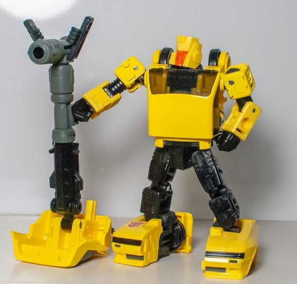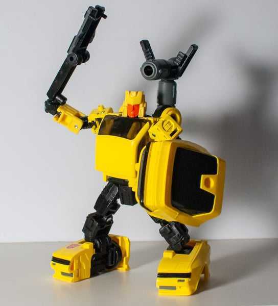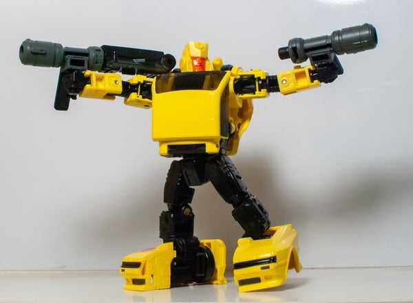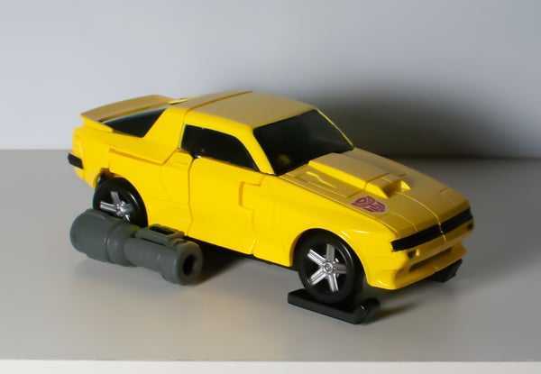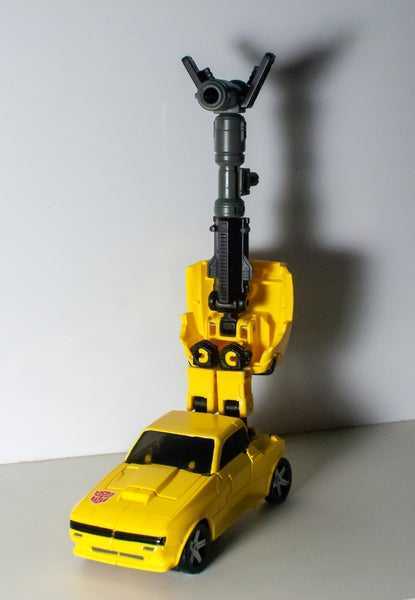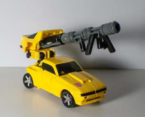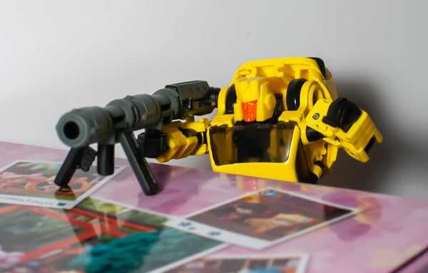 There’s less you can do with his accessories in this mode, owing to him only having connection points on the top and bottom of his car mode, but stock photography of the Bumblebee retool also offered this alternate way to mount his cannon, which involves popping the shield piece off and repositioning his arms, creating something that looks like the improbably large weapon emerged from a secret compartment.