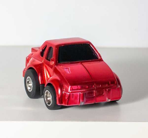 A funny thing about the design is it feels wrong for the character at first, because like the rest of the G1 Minibots, Hubcap’s original vehicle mode was a squashed, chibified, stylized version of a real sportscar, meant to resemble a Penny Racer toy instead of a real car, so it takes a moment to accept him in a more realistically-proportioned car mode.
