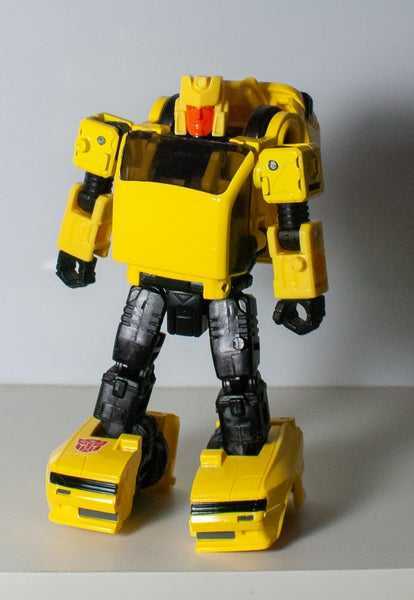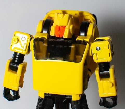 For the rest of his colors, he’s mostly a bright, Sunstreaker-y primary yellow, with some black limbs and accents, and smokey black windows, with a small Autobrand on his foot. While it seems like he has a really simple deco, sharper eyes than mine picked out that a lot of his yellow is actually painted on, including his feet, chest, backpack and shoulders. While it looks nice, I’m not a fan of too much paint, as even the most carefully QC’d figure can smudge and chip it, and sure enough, there’s a few tiny scratches in places on mine, like the chest. In fact, if you look closely, transforming him repeatedly has made those little rectangular tabs on his shoulders start to flake. While I don’t know about the later Bumblebee and Bug Bite retools, it’s a problem he shares with Cliffjumper, since all of the same areas are painted on him, as well.