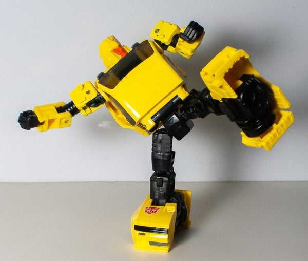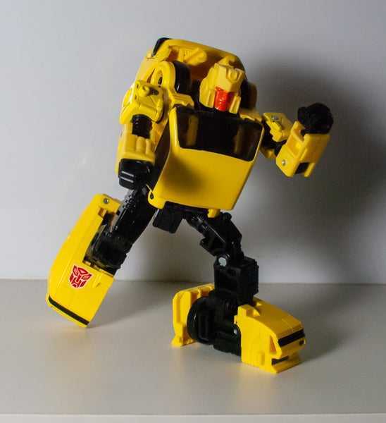 One of the big things Hubcap’s got going on for him is his articulation, which, get this, is actually superior to the old Masterpiece Bumblebee he cribbed some of his engineering from, because he a) has wrist swivels, and b) has incredible ankle tilts that can bend more than 90 degrees. Combine that with the expected head, shoulders, elbows, waist, and knees, and his big, stompy mini-bot feet, and he’s actually incredibly flexible and stable for a regular Deluxe, let alone something his size.
