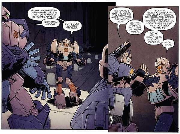 In terms of who he is, while his bio described him as a communications expert who also happened to be a smooth-talking, untrustworthy con artist, he’s mostly been notable for his absence. He didn’t show up on the cartoon at all, despite his fellow minibots at least getting cameos, and didn’t even have a longer Transformers Universe bio note published (though it was written, and uncovered years later). Combine that with the fact that he looks pretty similar to multiple more well-known characters (the Cliffjumper toy even had a yellow variant that looked really similar to him), and you have a textbook D-lister, something that’s only recently started to fade thanks to him finally getting some real exposure in the 21st century, as the star of a Collector’s Club novella (emphasizing the smooth-talker angle), and Nick Roche’s Sins of the Wreckers comic miniseries from IDW, (playing up the communications expert angle, pictured below).