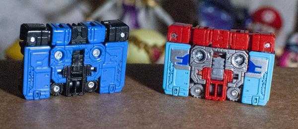I’ll be real: This pair has the weakest pseudo-tape mode out of all four molds in this bunch. While they do pull the same trick of using screwholes to resemble tape spools, there’s a massive chunk missing out of the side of each tape, wrecking the rectangular silhouette, and from the back, their bat mode faces and bodies are again, really visible, without even filling the space in the way Frenzy and Knok do.