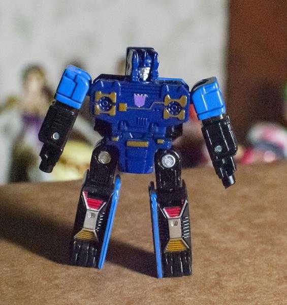 At least he’s got a nice headsculpt, with a tiny visor and scowl, along with a great-looking paint job, with the two shades of blue and black being highlighted with gold, silver, and other nice, bright paint apps, including a flea-sized Decepticon symbol. I particularly like the toy-sticker colors on his legs.